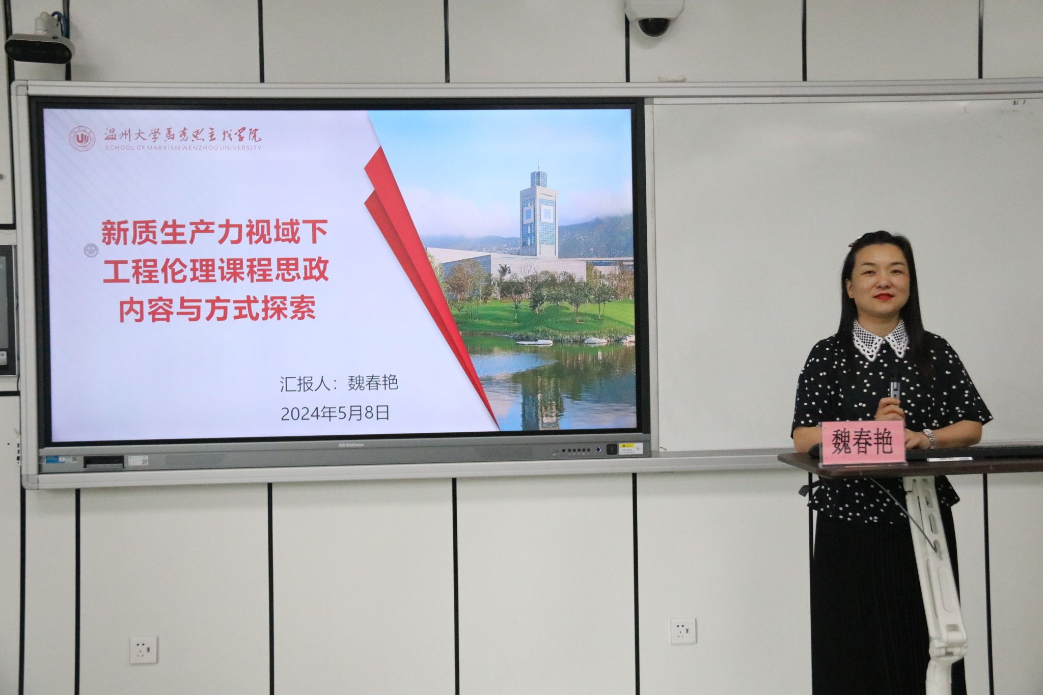 国产传媒 教师魏春艳以《新质生产力视域下工程伦理课程思政内容与方式探索》为题,围绕新工科教育的时代背景即国家要求大力发展新质生产力、工程伦理课程思政的内容、工程伦理课程思政的方式三个方面展开讨论,提出从整合教材内容:实现工程伦理课程思政精准化;创新教学方法:增强工程伦理课程思政实效性;拓展实践教学:强化工程伦理课程思政认可度;构建协同育人圈层:保障工程伦理课程思政持久性四个方面提升工程伦理课程思政教育。