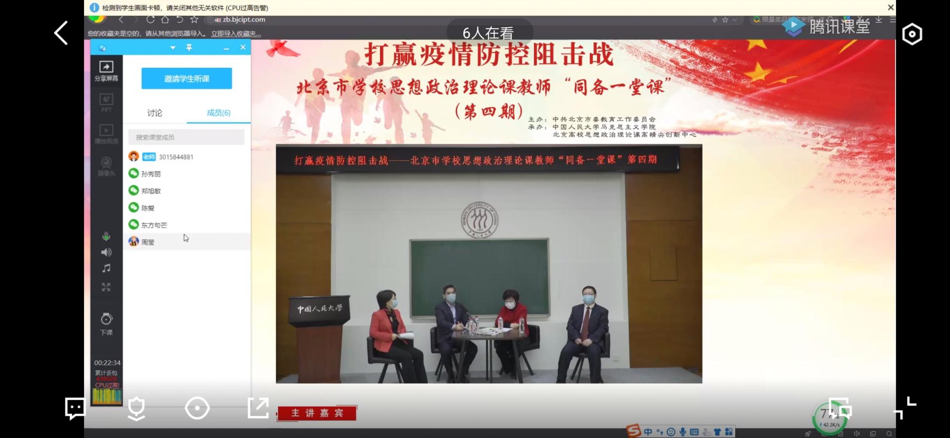 第四期北京市学校思想政治理论课教师“同备一堂课”活动邀请了清华大学艾四林教授、北京大学孙蚌珠教授、中国人民大学何虎生教授、中央财经大学冯秀军教授担任主讲嘉宾,市委教育工委副书记狄涛同志做总结讲话。课堂上,四位教授分别围绕概论、原理、纲要、基础等高校思政课必修课教育教学,有针对性就疫情防控融入思政课专题备课进行指导,并就相关重点、难点问题与师生代表进行交流探讨。国产传媒 全体专兼职教师在线观看了此次备课活动。观看后,教师们进行了热烈的线上讨论。大家纷纷表示参加此次活动受益匪浅,四位专家坚持用马克思主义的立场、观点、方法分析防控疫情阻击战中蕴含的的深刻理论,诠释了中国制度、中国力量、中国精神的优势,对老师们的思政课教学大有裨益。