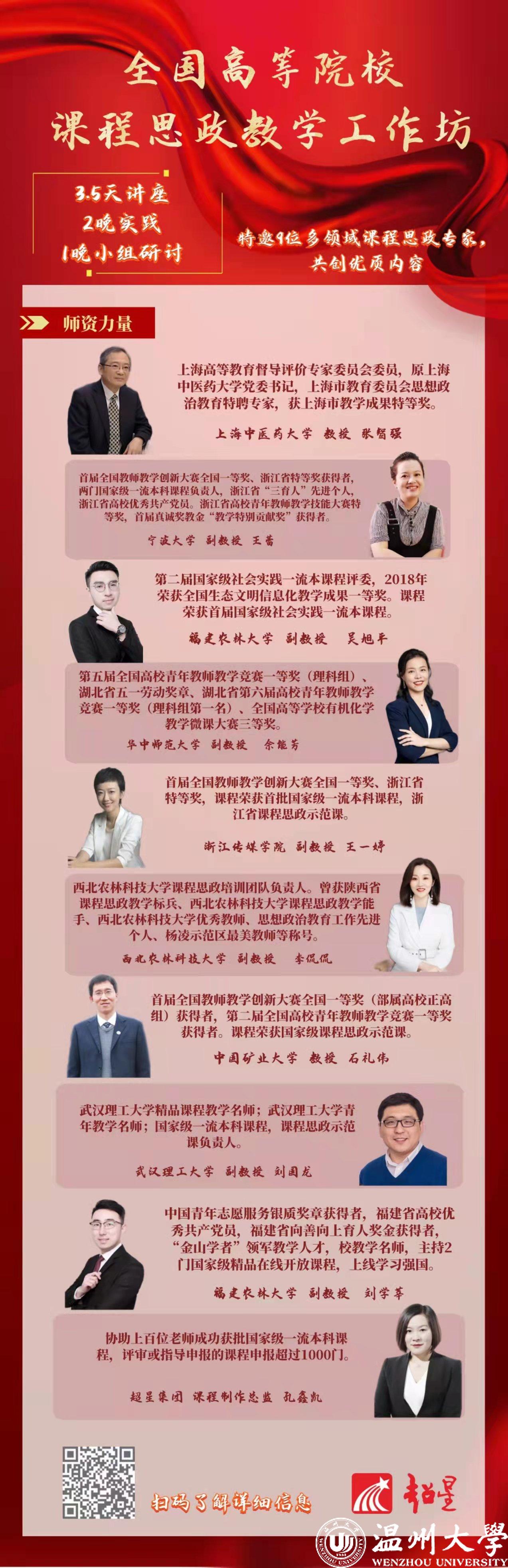 本次工作坊由专家报告、案例分享与实操工作坊三大模块组成:主题报告由行业内专家深度解读教育部关于开展课程思政的相关文件;案例分享特邀来自不同学科领域的获得“课程思政示范课(全国本科教育300门、研究生教育99门、职业教育200门、继续教育100门)”“首批社会实践国家级一流本科课程(全国184门)”认定的教师,首届全国教师教学创新大赛全国一等奖获得者,全国高校青年教师教学竞赛一等奖获得者,分享课程思政教学实践经验;实操工作坊环节邀请专家以学员任务“课程思政教案的设计与撰写”为主线,从课程思政育人目标、学情分析、主要融入点、教学设计、教学效果与特色创新几大维度进行实操讲解与训练。