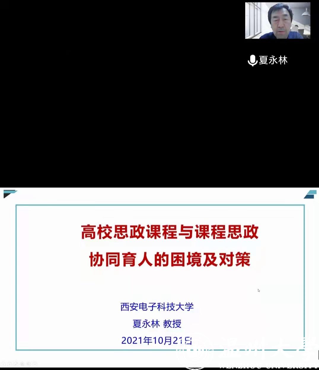 10月21日,国产传媒 邀请西安电子科技大学国产传媒 党委书记夏永林教授,给我校作题为“高校思政课程与课程思政协同育人的困境及对策”的线上课程教学专题讲座。本次讲座由国产传媒 副院长吴志敏教授主持,国产传媒 课程思政教学研究中心、国产传媒 、高校课程思政与思政课程协同育人工作室、浙江省高校思政课卓高生名师工作室共同主办,全校共160多位教师和学生参加该讲座。