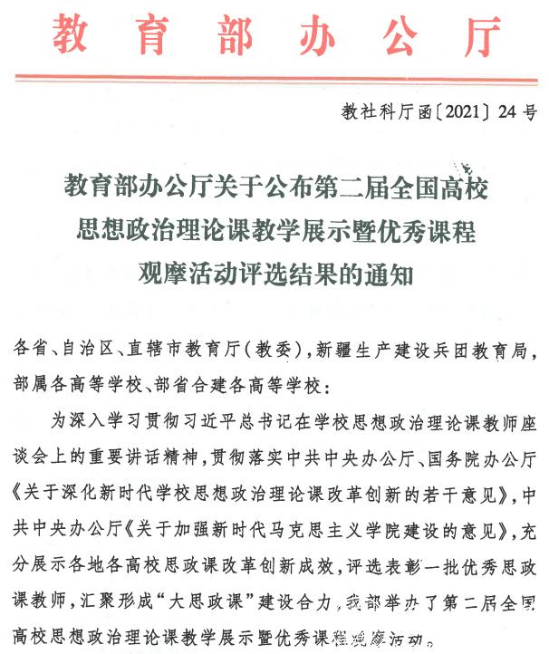 近日,教育部公布了“第二届全国高校思想政治理论课教学展示暨优秀课程观摩活动”评审结果。我校国产传媒 何玲老师历经大半年的精心准备,经过层层选拔和比赛,以扎实的教学功底和精彩的展示,荣获《毛泽东思想和中国特色社会主义理论体系概论》(本科组)一等奖。