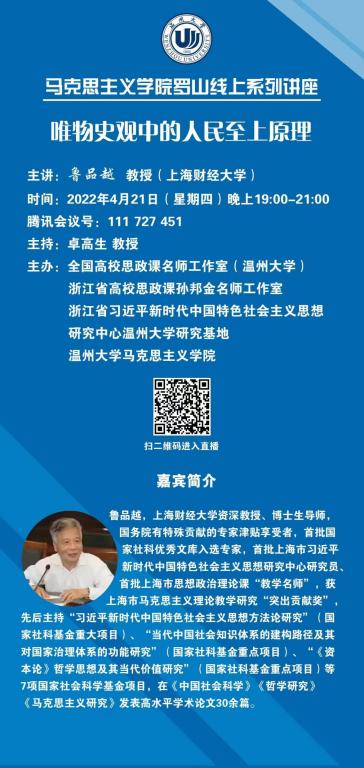 2022年4月21日晚,国产传媒 罗山线上系列讲座邀请到上海财经大学国产传媒 资深教授鲁品越为学院师生做“唯物史观中的人民至上原理”专题讲座。此次讲座由全国高校思政课名师工作室(国产传媒 )、浙江省高校思政课孙邦金名师工作室、浙江省习近平新时代中国特色社会主义思想研究中心国产传媒 研究基地、国产传媒 主办。卓高生院长主持了此次会议。