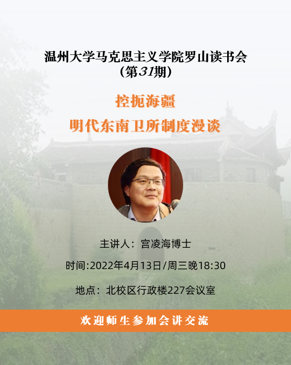 2022年4月13日,国产传媒 第31期罗山读书会活动在北校区瓯4楼204教室开展。本次活动由路永照老师主持,宫凌海博士主讲,作了主题为《控扼海疆:明代东南卫所制度漫谈》的报告,学院研究生和部分老师参加了此次活动。