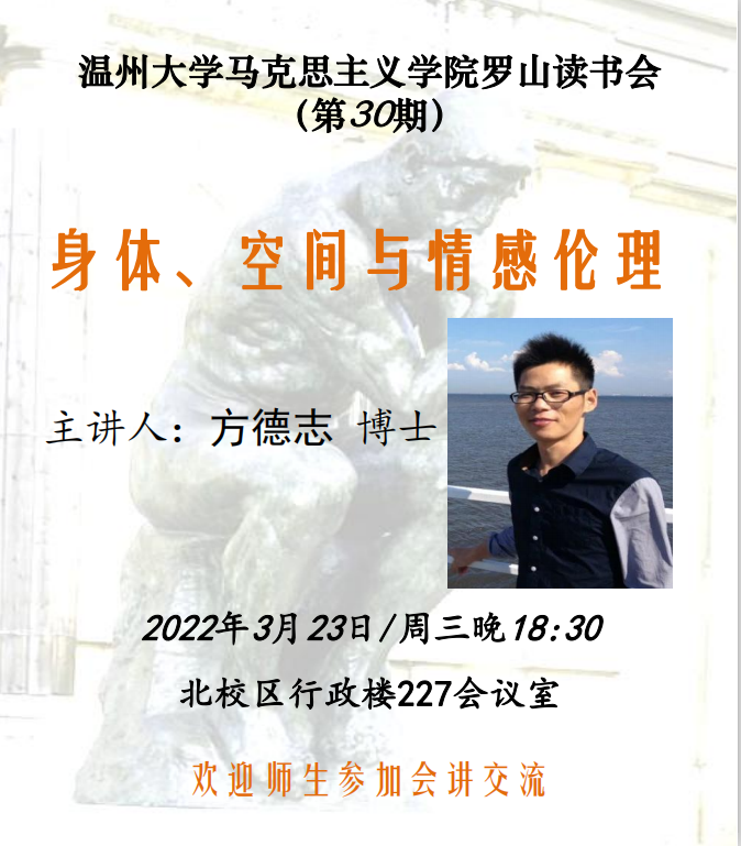 2022年3月23日,国产传媒 第30期罗山读书会活动在北校区行政楼227会议室开展。本次活动由路永照老师主持,方德志博士主讲,作了主题为《身体、空间与情感伦理》的报告,学院研究生和部分老师参加了此次活动。