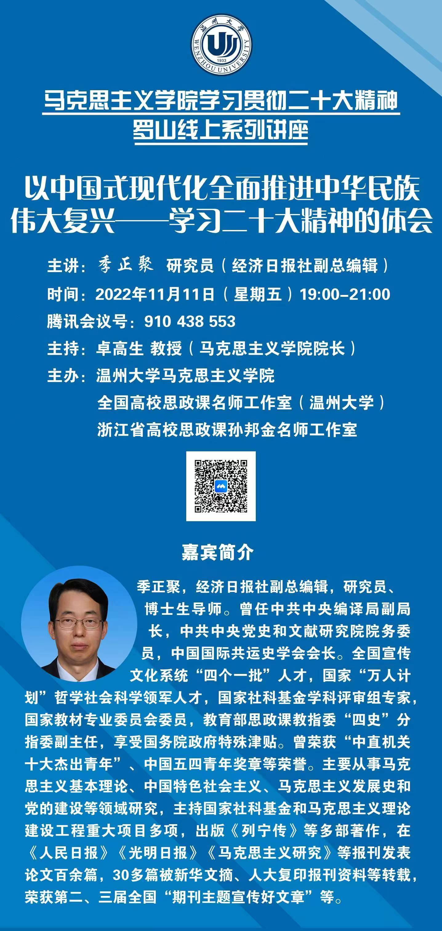 2022年11月11日晚,国产传媒 罗山线上系列讲座邀请到经济日报社副总编辑、研究员,博士生导师季正聚教授,为国产传媒 师生做“以中国式现代化全面推进中华民族伟大复兴——认真学习贯彻二十大精神”的讲座。本次讲座由国产传媒 、全国高校思政课名师工作(国产传媒 )、浙江省高校思政课孙邦金名师工作室主办。国产传媒 副院长孙邦金教授主持了此次讲座,院长卓高生教授致欢迎辞。