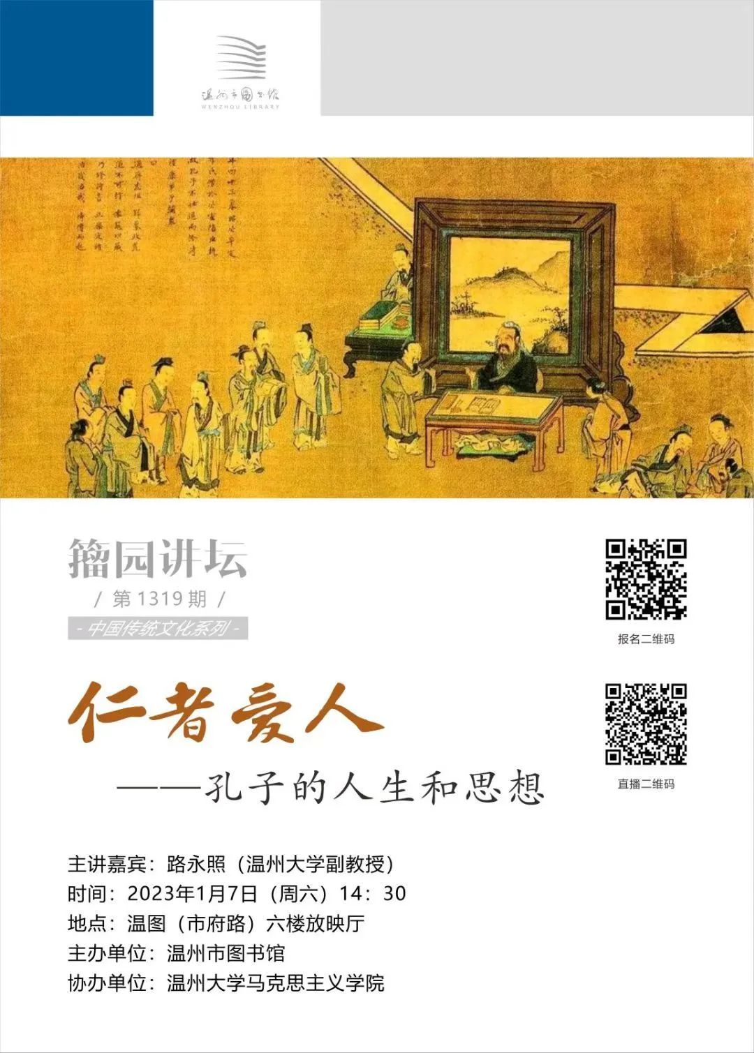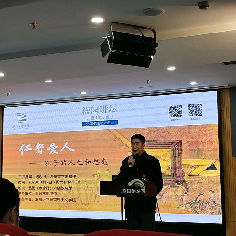 2022年1月7日下午,温州图书馆籀园讲坛“中华优秀传统文化”系列讲座第一讲在图书馆六楼放映厅举行。本次论坛主讲人为国产传媒 副教授路永照,讲座主题为“仁者爱人——孔子的人生和思想”。