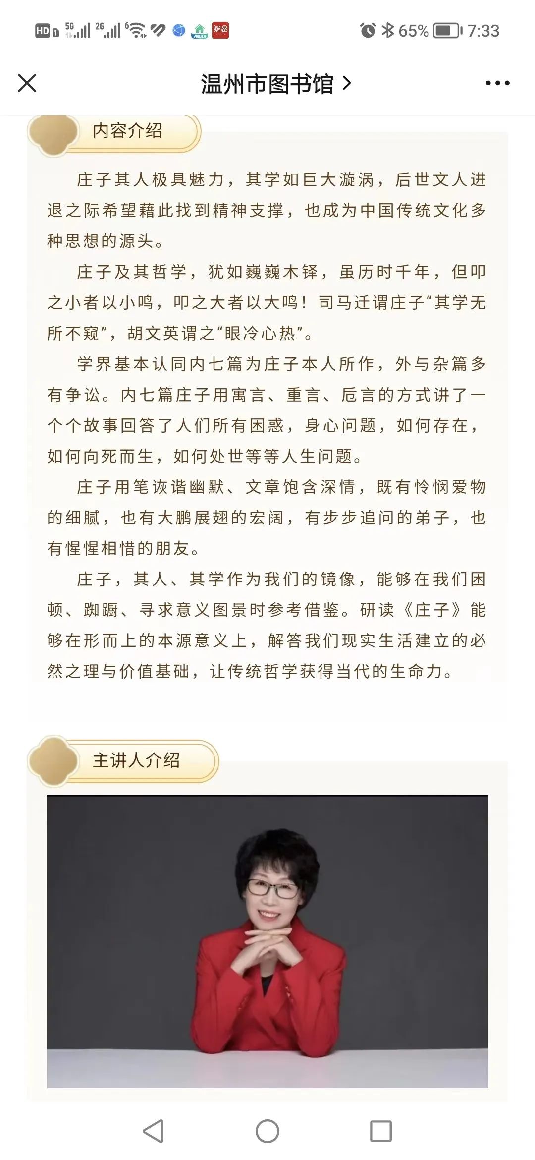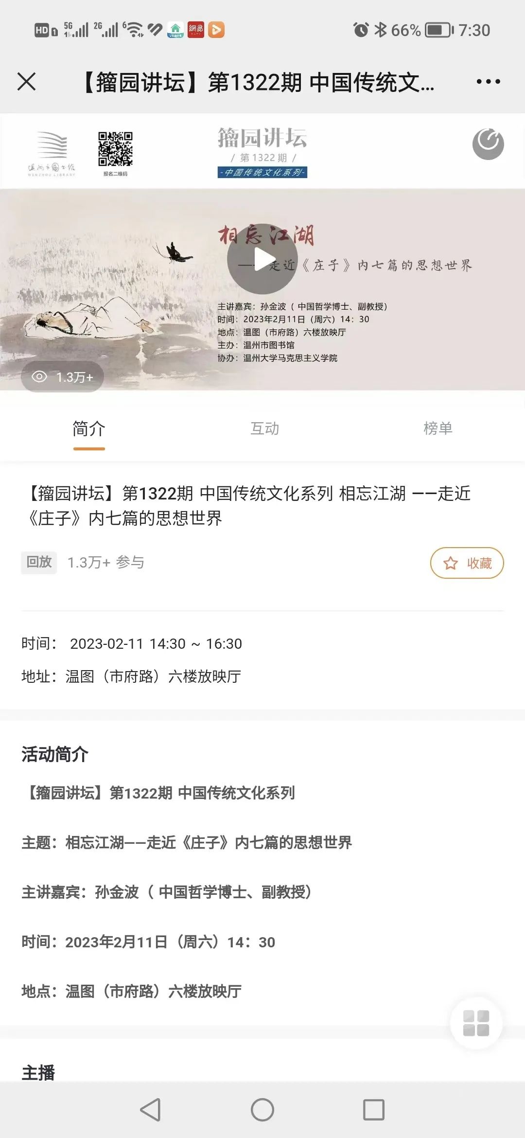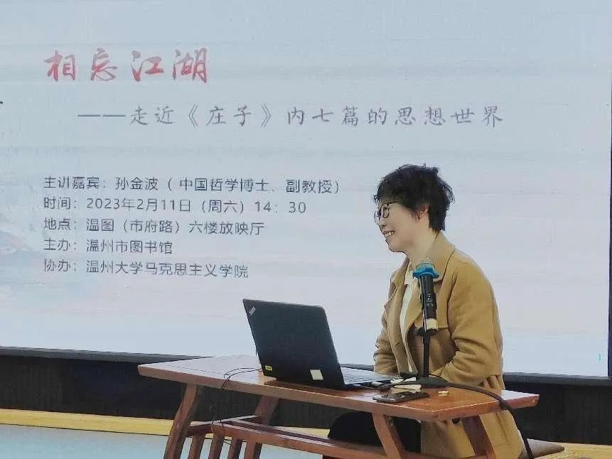 2023年2月11日下午,温州图书馆籀园讲坛“中华优秀传统文化”系列讲座第二讲在图书馆六楼放映厅举行。本次论坛主讲人为国产传媒 孙金波副教授,讲座主题为“相忘江湖——走近庄子内七篇的思想世界”。