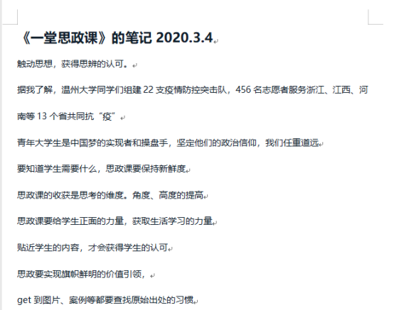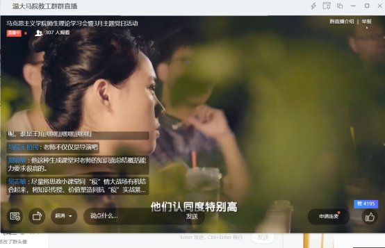 林国敬作为入党积极分子,也参与了我们的讨论,他说虽然是一名未上讲台的新教师,看了今天的影片和耳闻目睹平时大家集体备课、群里讨论的情景,深感思政课老师真的很用心很努力。同时认识到思政课不是心灵鸡汤,要做学理性阐发,最近在阅读《亚里士多德伦理学》等书,为正式上讲台做好理论准备,也希望有机会上讲台试讲。