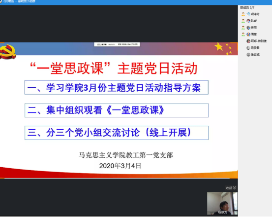 3月4日,国产传媒 组织了师生理论学习会暨3月主题党日活动。教工第一党支部全体党员学习了学院3月份主题党日活动指导方案后,通过钉钉平台认真收看了“一堂思政课”影片,大家边听边记边思考,并在讨论区热烈讨论。活动结束以后,教工第一支部分三个党小组开展观影后的线上研讨。老师们围绕(1)如何做好思政课教师?(2)如何上好思政课、发挥好思政课作用?(3)如何培养思政课教师后备人才?(4)当前思政课教学及思政课教师后备人才培养如何落实好“两手都要硬、两战都要赢”的重要精神?等问题进行了热烈的讨论,大家纷纷表示此次活动受益匪浅。