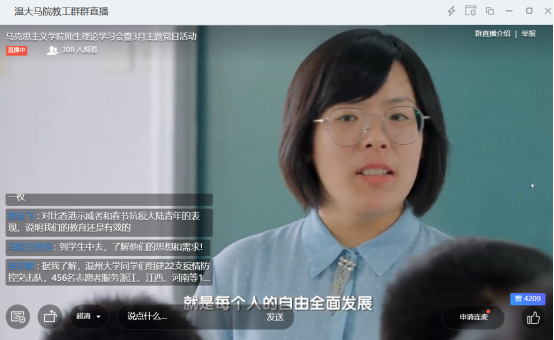 郑旭敏:当前线上教学是看不到学生的,线上教学质量如何保障,要观看平台后面对学生上课的记录;如何应对平台出现问题,要多种准备;探索新技术加载后的思政课堂,增强有效互动;如何发挥教师主导、学生主体作用,促使课堂生成,需要老师深厚的理论功底和超强的课堂驾驭能力;思政课的力度在于价值引领,比如学生获得感最强的可能是课前演讲后老师的精彩点评。