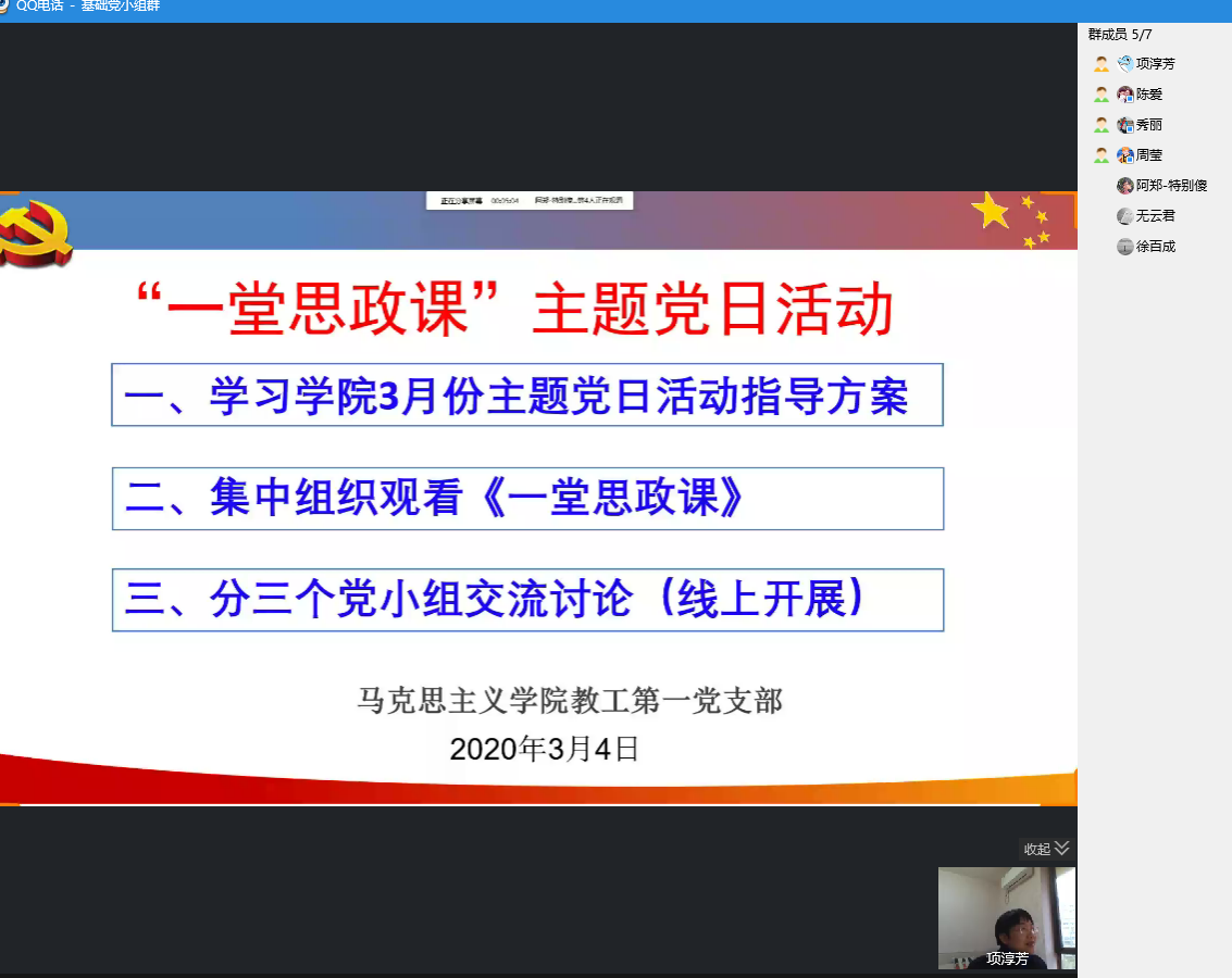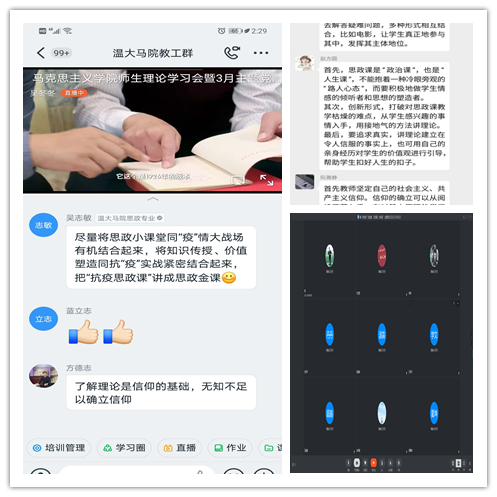 共同观赏之后,各师生党支部展开了热烈的线上交流。教工第一党支部、思政系党支部、原理党支部、行政党支部的教师党员们也纷纷表达了作为思政课教师、思政教育工作者身上肩负的使命和担当。国产传媒 教工第一党支部书记项淳芳说到:听了讲座深有感触,为六位优秀同行的敬业投入所感动,正因为有这样一支“可信、可敬、可靠,乐为、敢为、有为的思政课教师队伍,有无数思政人的默默付出,所以对思政课的前景充满信心,也感受到作为思政人前所未有的理直气壮和使命担当。在当前防控疫情战和发展主动战的艰巨任务下,作为马院教师,要靠前尽好职责,勇于回答时代课题。
