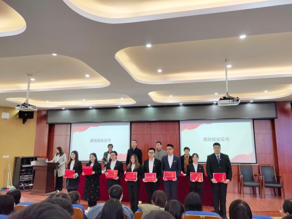 在慷慨激昂的《国歌》声中拉开了本次结业典礼的序幕。首先,由李培芬老师宣读结业名单,商学院党委书记郑彩莲老师、法学院党委书记林钦老师、国产传媒 党委书记王柏民老师、国际教育学院党委书记林爱菊老师给各学员颁发结业证书。