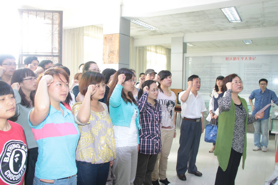 万全镇的新农村建设考察结束后,思政部师生一行怀着崇敬的心情来到了位于郑楼镇的叶廷鹏烈士纪念馆,一起缅怀我们的革命先烈,告慰烈士英灵。观看了纪念馆的图文资料,了解革命烈士的悲壮事迹后,全体师生都深受感动,感受中国革命的无私奉献精神,接受了一次生动的爱国主义教育。在思政部党总支书记任映红教授的领誓下,思政部全体党员面对党旗,重温入党誓词:“我志愿加入中国共产党,拥护党的纲领……”。