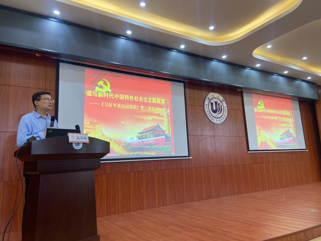 这一重要著作出版以来,在广大党员、干部、群众中引起强烈反响,掀起学习热潮。在本次政治理论学习会中,王习明教授结合这一著作的出版背景、总体结构分析其逻辑起点、思想方法和语言艺术,结合当下我国的发展现状和社会实际,对全书的19个专题进行深入浅出地剖析。这19个专题全面地涵盖了“八个明确”和“十四个坚持”的内容,体现了党的基本理论、基本路线、基本方略的主要脉络。王习明教授指出“谱写新时代中国特色社会主义新篇章”作为本书的第一个专题,指明了“谱写新篇章”的战略安排和实践路径,是全书的逻辑起点,并从“高举中国特色社会主义伟大旗帜”、“全面把握中国特色社会主义进入新时代的新要求”、“贯彻新时代中国特色社会主义思想和基本方略”、“要有新气象,更要有新作为”、“继续进行具有许多新的历史特点的伟大斗争”、“不断开辟当代中国马克思主义、21世纪马克思主义”、“必须胸怀大局,做好自己的事情”等七个方面对“谱写新时代中国特色社会主义新篇章”作重要阐释,对领会贯穿第三卷的马克思主义思想方法和工作方法进行凝练总结。