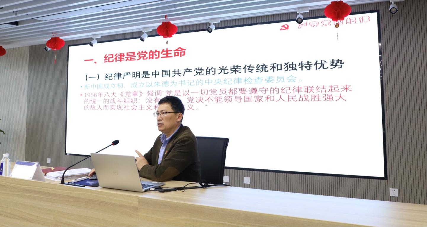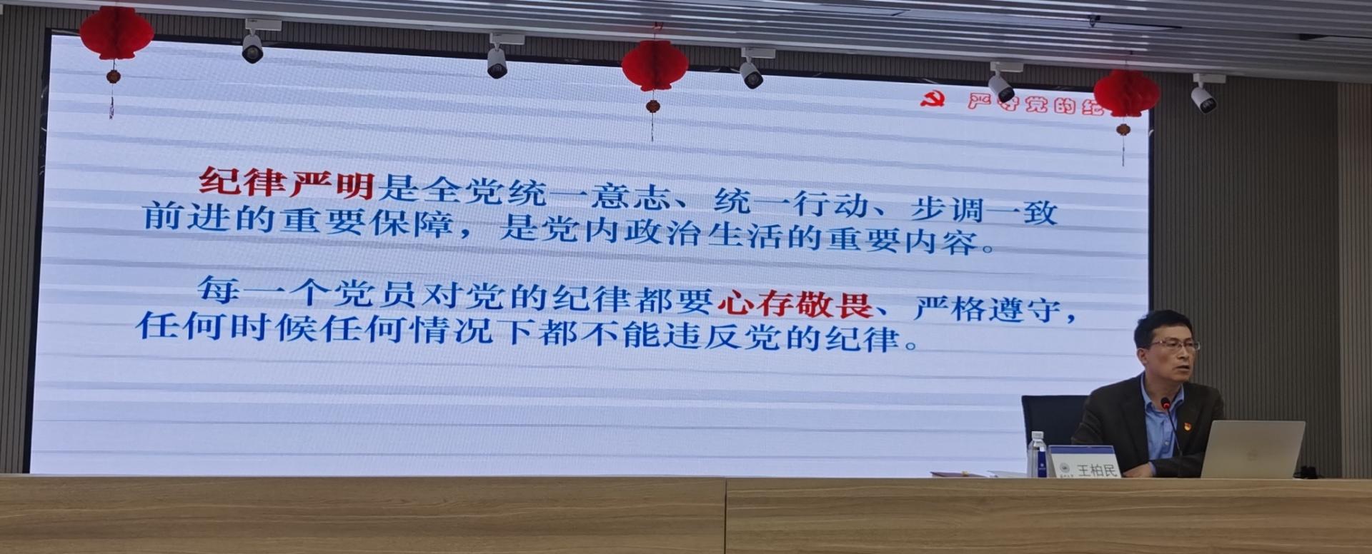 在简短的五分钟休息过后,国产传媒 党委书记王柏民老师为学员们做《严守党的纪律》主题讲座。王老师以“入党誓词”为切入点,结合鲜活的案例,从纪律是党的生命、党的纪律主要内容以及严守党纪的新特征新要求三个板块做具体的讲解。最后,在讲座结束时,王老师对在座的党员骨干们提出要求:“每一个党员对党的纪律都要心存敬畏、严格遵守,任何时候任何情况下都不能违反党的纪律。”