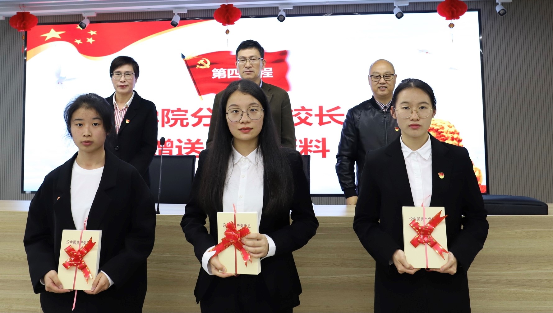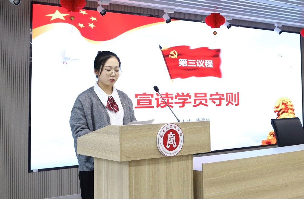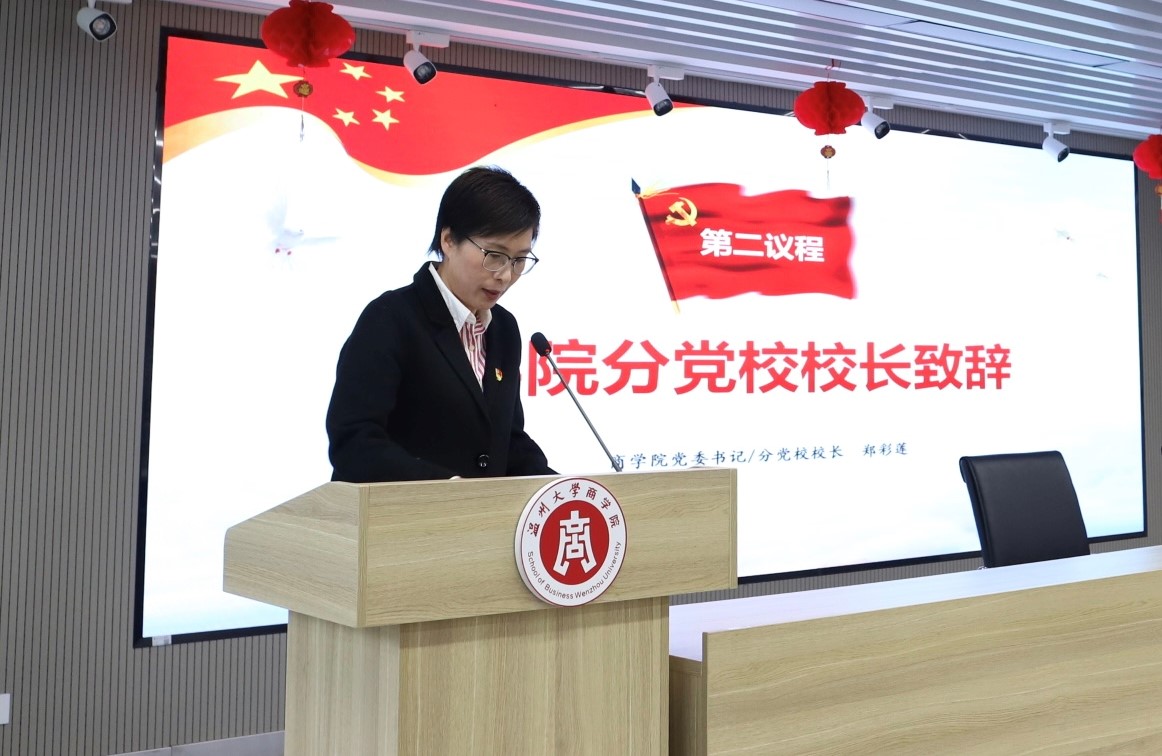 本次开班典礼在庄严的国歌声中拉开了的帷幕,紧接着商学院分党校校长郑彩莲上台致辞。她提出“为什么学”、“怎么学”、“学了干什么”三个问题引导学生党员骨干们思考;同时也希望学员们通过培训切实提高政治能力、调查研究能力、科学决策能力、改革攻坚能力、应急处突能力、群众工作能力、抓落实能力,成为一批政治坚定、思想过硬、德才兼备、勇挑重担的优秀青年党员骨干队伍。随后,本次培训班班主任魏梦瑶老师宣读了《学员守则》,同时也希望各位学生党员骨干在接下来学习中遵守守则,服从班级管理,以党员的要求严格要求自己,认真学习,在思想上有所收获。开班仪式最后,三位校长向学员代表们赠送学习资料。