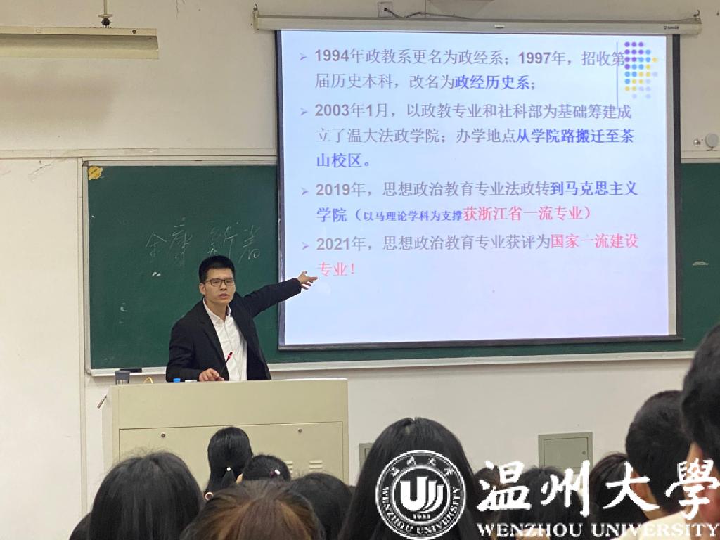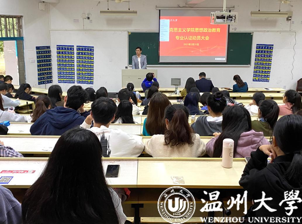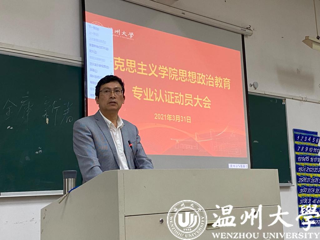 随后,由吴志敏副院长为我们系统的阐述思想政治教育专业认证的相关内容。吴院长从专业历史改革、专业认证成效、专业认证契机三个方面进行讲解。温大思想政治教育专业自1978年开设以来,至今已有43年的历史。在这43年之中,思想政治教育专业培育了一批批优秀的学子走入社会,温大思政人的脚步遍布全国各地。而国产传媒 思想政治教育专业也在2019年获省一流专业、2021年获国家一流专业,同时也是一流学科、重点专业、重点建设国产传媒 。在卓有成效的专业建设下,国产传媒 有着深刻的专业认证契机:把握八项认证内容,贯彻“学生中心、产出导向、持续改进”的认证理念,追求专业认证高标准。最后,吴院长以师生共勉,共同迎接专业更好的未来给本次动员大会画上句号。