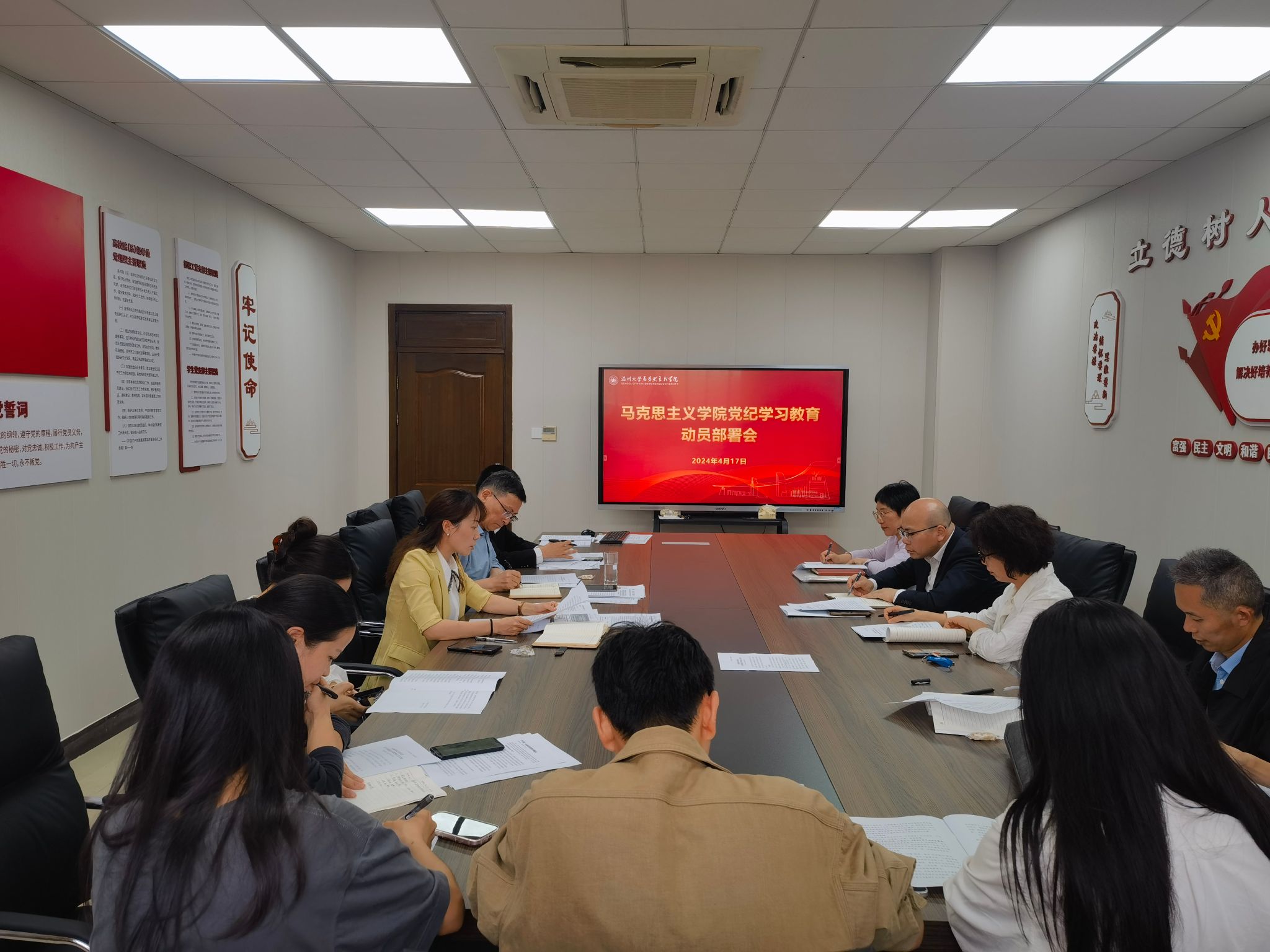 4月17日下午,国产传媒 召开党纪学习教育工作动员部署会,传达学习贯彻习近平总书记关于党纪学习教育的重要讲话和重要指示精神,贯彻落实校党委党纪学习教育工作部署会精神,动员部署学院党纪学习教育工作。会议由王柏民书记主持,学院党委委员、领导班子、专职组织员、师生党支部书记参会。