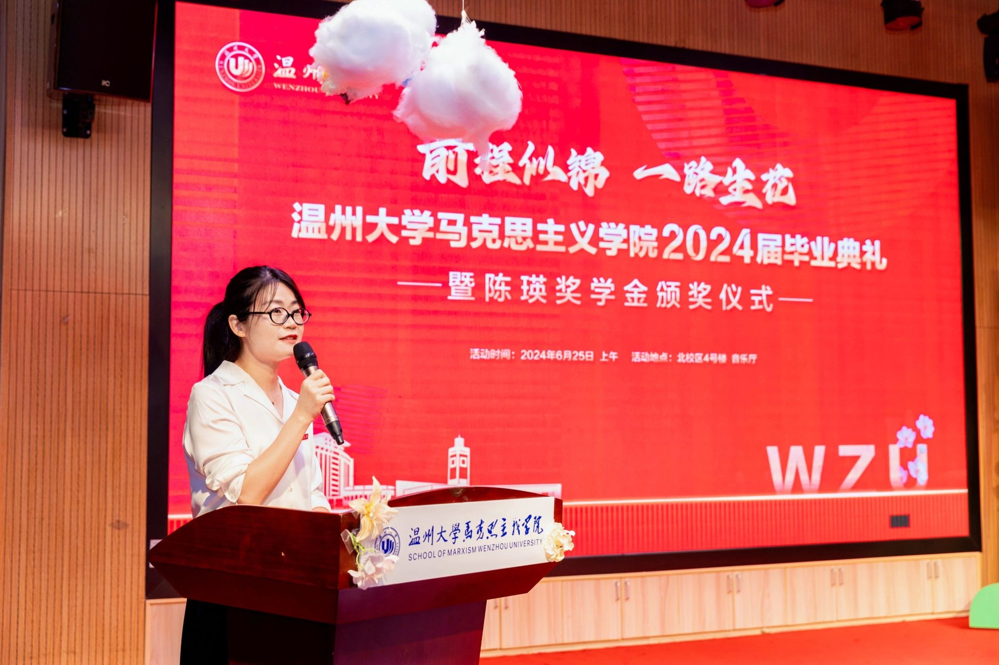2024届研究生毕业生代表刘宁涛、本科生毕业生代表朱暄对自己在马院的学习生活展开了回顾,表达了对学习、对学院、对老师们真挚的感激之情。在未来的生活中,不忘“为梦想而学习,为真理而斗争”的院训,保持纯粹、永远真诚。“轻装策马青云路,人生从此叹长风”。愿每一位毕业生青春葳蕤、生命富饶,无愧自我、无愧时代。