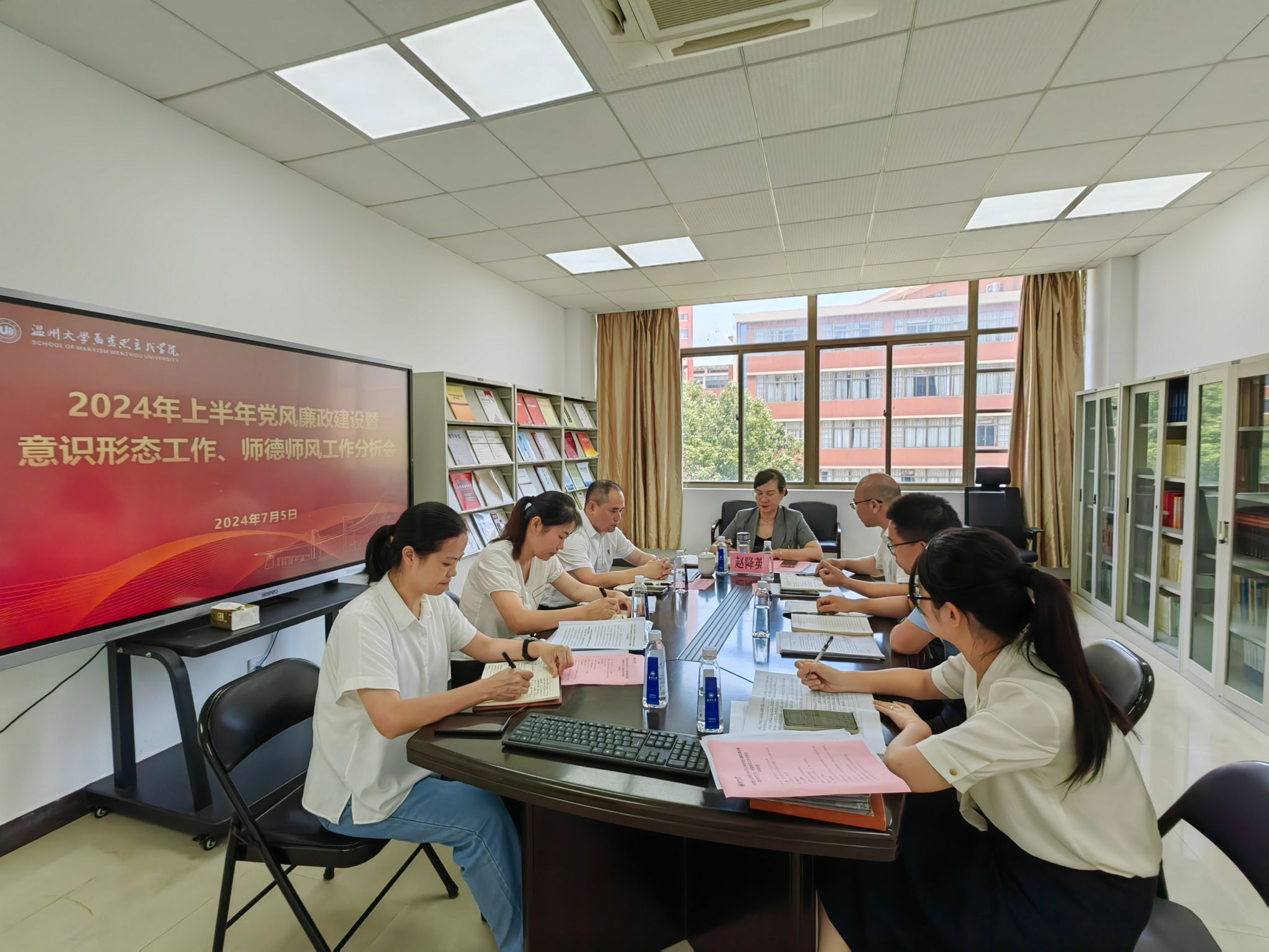 会上,学院党委副书记、纪委书记吴冬冬同志代表学院作2024年上半年党风廉政建设、意识形态工作、师德师风工作汇报。2024 年上半年,国产传媒 在学校党委的正确领导下,坚持以习近平新时代中国特色社会主义思想为指导,深入贯彻落实党的教育方针和党纪学习教育要求,紧扣工作主题主线,高度重视党风廉政建设、意识形态安全和师德师风工作,全面落实从严治党,系统推进政治生态建设。在党风廉政建设、意识形态工作、师德师风工作方面取得了显著的工作成效。全院师生团结奋进,继往开来,在“清廉马院”建设上取得了扎实的工作成效,学院荣获“国产传媒 清廉单元建设示范标杆单位”,学院团委荣获“温州市五四红旗团委”、学院研会荣获“思想教育与组织先进奖”。