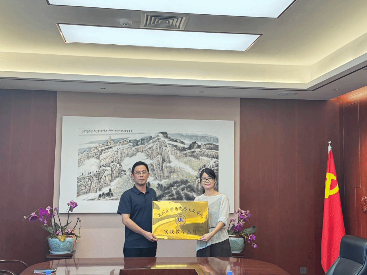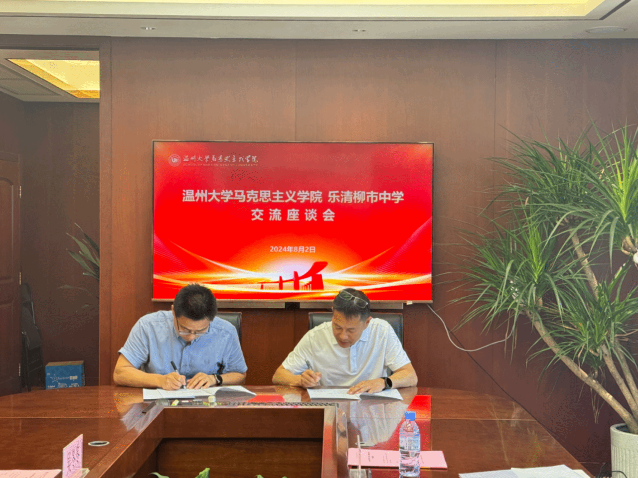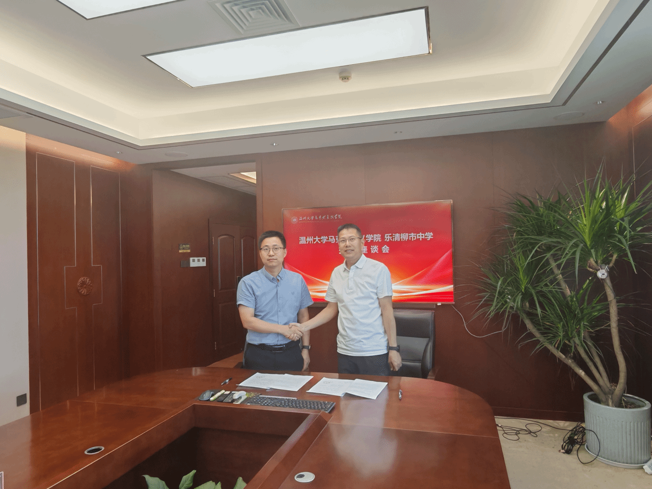 2024年8月2日,国产传媒 与乐清市柳市中学交流座谈会暨实践教学基地签约授牌仪式在国产传媒 南校区举行。国产传媒 副院长孙邦金、党委副书记吴冬冬、研究生教育教研室主任宫凌海、乐清市柳市中学校长沈明武、副校长郑洁、办公室主任陈飞云出席座谈会暨签约授牌仪式。