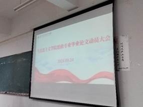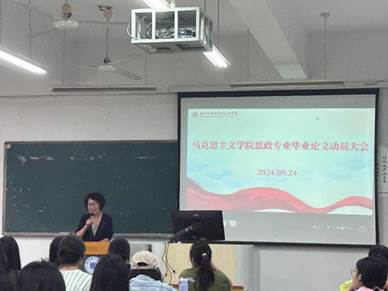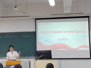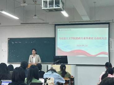 2024年9月24日上午,为全面部署本科毕业论文工作,明确目标要求,激发同学们的学术追求,国产传媒 于北校瓯4-306教室举办了2021级国产传媒 本科毕业论文动员大会暨考研动员大会。国产传媒 副院长何玲、副书记吴冬冬、思政系系主任孙金波以及安保国老师、张海波老师等论文指导老师代表出席本次大会,学院21级政教全体学生参加本次大会。大会由思政系系主任孙金波主持。大会上,学院教师对本科生毕业论文工作提出要求,讲话中饱含着学院教师对学生的深切勉励。