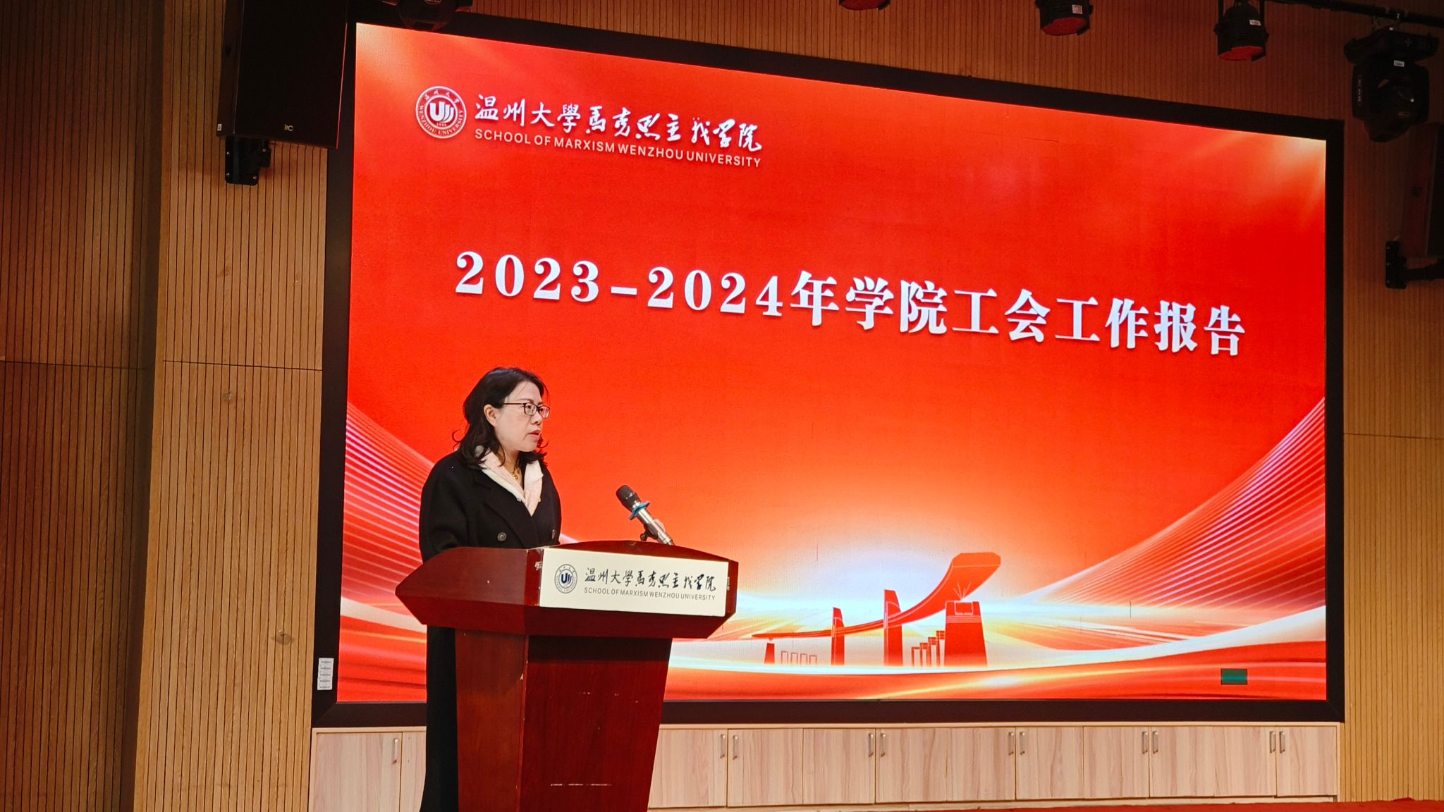 郑旭敏主席作2023-2024年国产传媒 分工会工作报告。她指出,过去两年工会积极开展工作,在协同联动、服务师生、暖心工程等方面成效显著。及时落实校工会工作部署,组织教职工参与多项活动,在文体赛事中取得优异成绩。参与学院民主管理与监督,建立特色模式,开展系列暖心活动,增强凝聚力。学院分工会获2023年度校优秀分工会。未来,工会将继续努力,团结教职工和工会会员,共创学院美好未来。