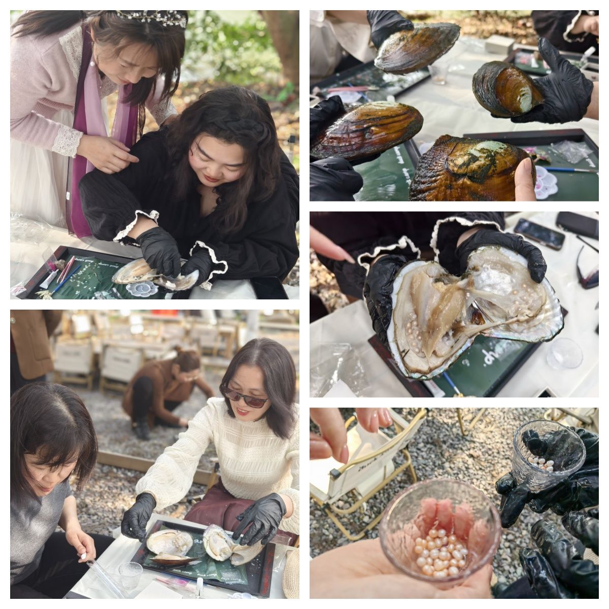 用餐后,活动迎来了手工创作环节——制作钿螺胸针。钿螺,作为一种承载着深厚文化意义和审美价值的传统手工艺品,深受人们喜爱。本次活动特别提供了竹子和蝴蝶两种图案的模具,分别象征着坚韧与高洁。在工作人员的悉心指导下,女教职工们兴致勃勃地挑选颜色,精心雕刻,每一件作品都融入了她们的智慧与创意,彰显了个人的独特魅力。不久,一系列精致、色彩缤纷的钿螺成品呈现在众人面前,不仅美化了现场,也成为了每个人专属的纪念品。活动的高潮环节是体验开蚌取珍珠。在大家的热切期待中,普通的河蚌缓缓揭开其神秘的面纱,瞬间,那些璀璨夺目、色彩斑斓的珍珠展露无遗,赢得了在场所有人的热烈掌声。这不仅是一次对自然界奇迹的探索,也是一次对生活美好寓意的深刻领悟。