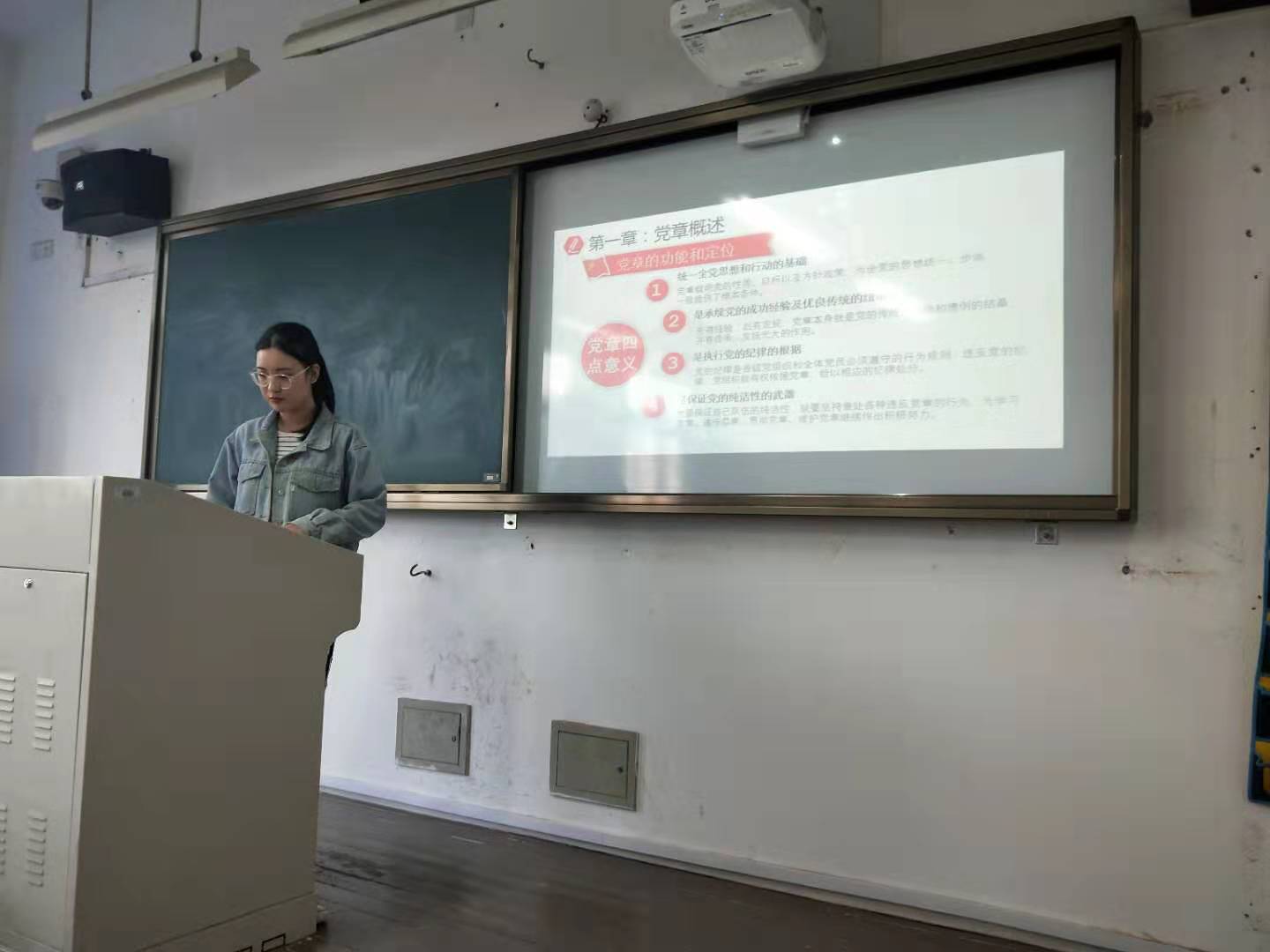 之后郜晨佳同志带领党员同志们进行党章学习。通过对党章概述、发展历程、总纲和条文部分的简单学习,各位党员回顾了党章基本内容,重点学习了党员的义务,牢记习近平总书记对学习党章的四点要求,并让各位党员在心中树立宪法意识,争做合格党员。