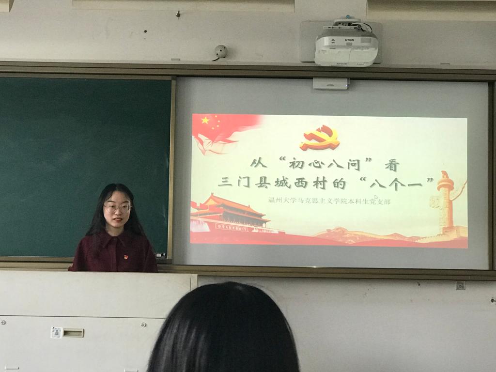 首先王晓花同志通过分享三门县城西村八任书记,即章正合、金积贵、章以齐、叶加法、章宏将,章宏军、章平一、章以家的先进事迹,引出八任书记在其任职期间所展现的“初心八问”,即做得正不正,干得实不实,民心齐不齐,做加法会不会,脑袋富不富,生态好不好,搞股份制行不行,融合成不成。在集体学习后,各位党员分别分享了自己印象最深刻的书记事迹。围绕“谈谈八位书记先进事迹对党员发挥先锋模范作用的借鉴意义”,井新云同志表示:八位书记把人民利益放在首位,为群众解难题,促发展,虽然实现的方式不同,但是初心都是一致的,这也激励党员要坚守初心,走群众路线。王雅妮同志表示:书记们紧跟党的政策,并且根据本村的实际情况,发展五位一体建设,这告诫我们党员要坚持党的领导,要不忘初心,脚踏实地,时刻拥护党的路线、方针、政策。结合主题教育,阮雅静同志谈了谈“初心八问”给她带来的体悟:八任书记贡献不同,但是都坚守了初心原则,把人民放在首位,并且从五位一体建设中促进了城西村的发展,这让我感受到了他们内心的坚守,这也是我们每位党员要学习的精神,坚守初心,不忘使命,砥砺前行。