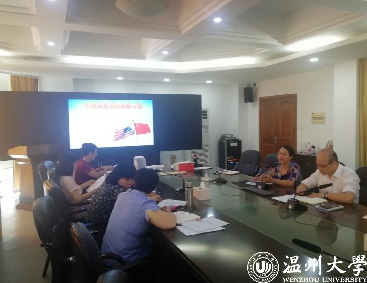 会上,国产传媒 副院长卓高生副教授首先就此次集体备课会的召开背景做了阐述,随后,谢建芬老师主要从特朗普执政后的中美贸易战进程回顾和影响、中美贸易战背景和实质、中美贸易战中的中国立场和前景三个方面进行论述。她指出,一定要告诉我们的大学生坚定信心,相信中国政府能妥善应对此次争端。