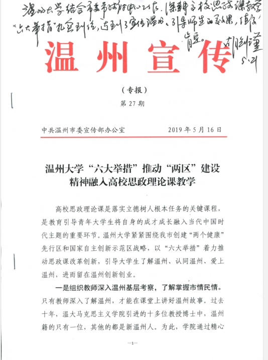 由温州市委宣传部5月16日印发的第27期《温州宣传》专题报道了《国产传媒 “六大举措”推动“两区”建设精神融入高校思政理论课教学》,介绍了温大马院围绕温州“两区”建设中心工作,在思政课教学及教师科研、社会服务中积极开展系列活动的情况。马院的做法受到了中共温州市委常委、宣传部长胡剑谨的批示肯定和国产传媒 党委书记谢树华的点赞。胡剑谨部长批示说:“国产传媒 结合市委市政府中心工作,深耕高校思政课教学,‘六大举措’扎实到位,达到了宣传温州、引导师生的效果,值得肯定。”谢树华书记点赞说:“马院既说又做,赞一个。”领导的肯定点赞给了马院教师们莫大的鼓励和鞭策。