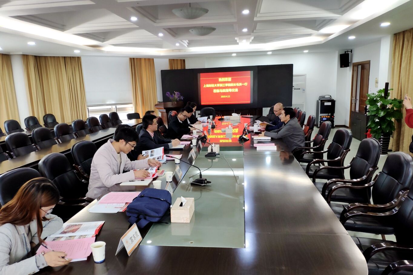 4月11日下午,上海财经大学浙江学院院长马洪、党委副书记孔德民带领思政教师一行9人来国产传媒 考察交流。国产传媒 院长孙武安代表学院致欢迎词,并向客人介绍了学院建设及学科科研发展情况。上海财经大学浙江学院院长马洪、党委副书记孔德民先后介绍了上财浙江学院的情况及此次调研学习的由来与目的,旨在通过学习温大思政课教学工作的先进理念、方法和创新之处,来提升思政课教师理论教学和科研能力水平。国产传媒 副院长卓高生做了“一化六制:问题导向的高校思政课综合改革与实践”的汇报。座谈会上双方教师就思政课教学改革共同面临的问题进行深入的交流。