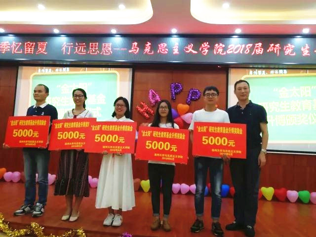 受邀出席本次晚会的国产传媒 党委副书记、马院硕士生导师牟德刚教授为今年考博成功的五位同学颁发了“金太阳”研究生教育升博奖励金,并勉励毕业生继续勇往直前,再创辉煌。