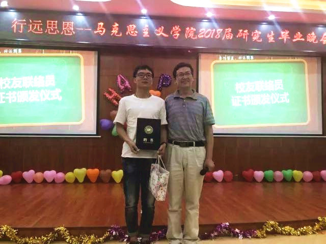王柏民书记为18届毕业生校友联络员颁发证书并送上学院特制的校友纪念品,并期望毕业生们能够“常回家看看”,常回马院看看。毕业生代表张慧中、李雪、安保国等三位同学分别就考博、就业、校友工作等方面发言,分享了升学、就业的经历,也表达了对学院及师长的感激之情。