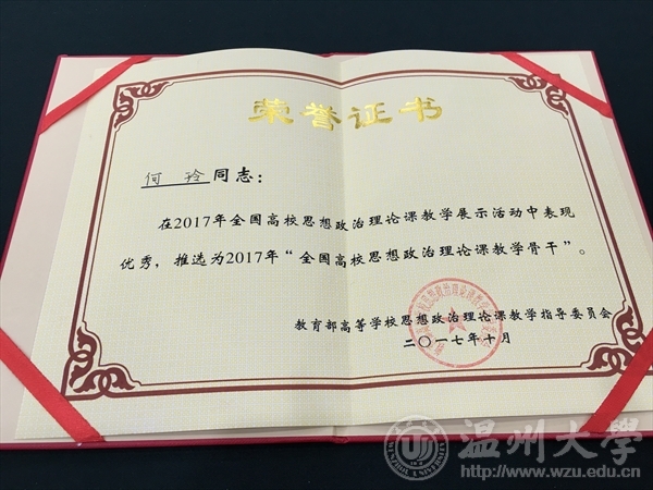 参会教师何玲被授予“全国高校思想政治理论课教学骨干”荣誉称号。