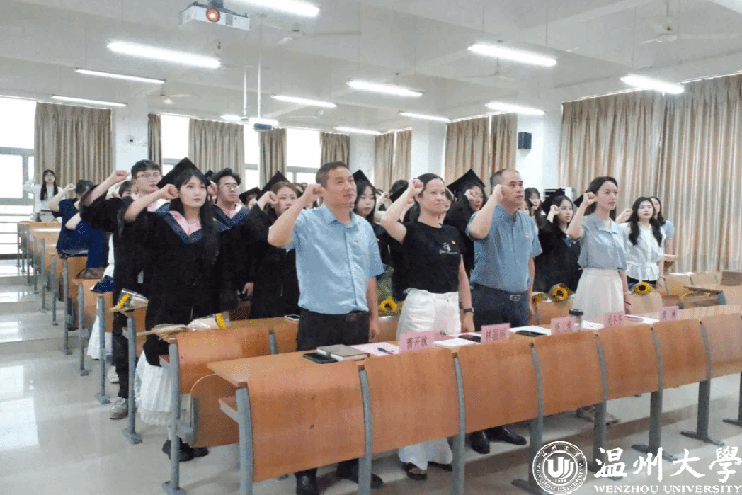 在2025届学科思政毕业生党员周皓阳的领誓下,全体毕业生党员郑重举起右拳,重温入党誓词,通过一句句铿锵有力的誓词回望入党初心,激励着党员永葆政治本色,在未来征程中始终以党员标准严格要求自己。