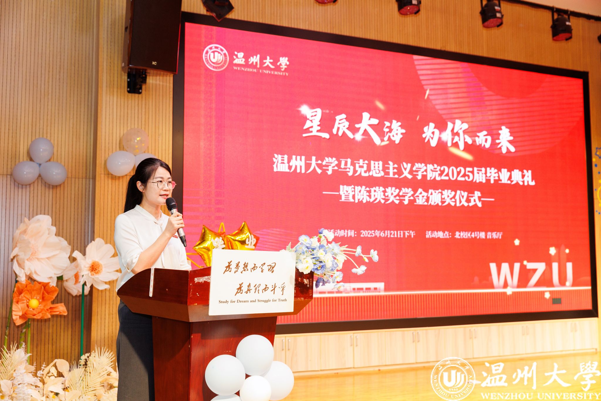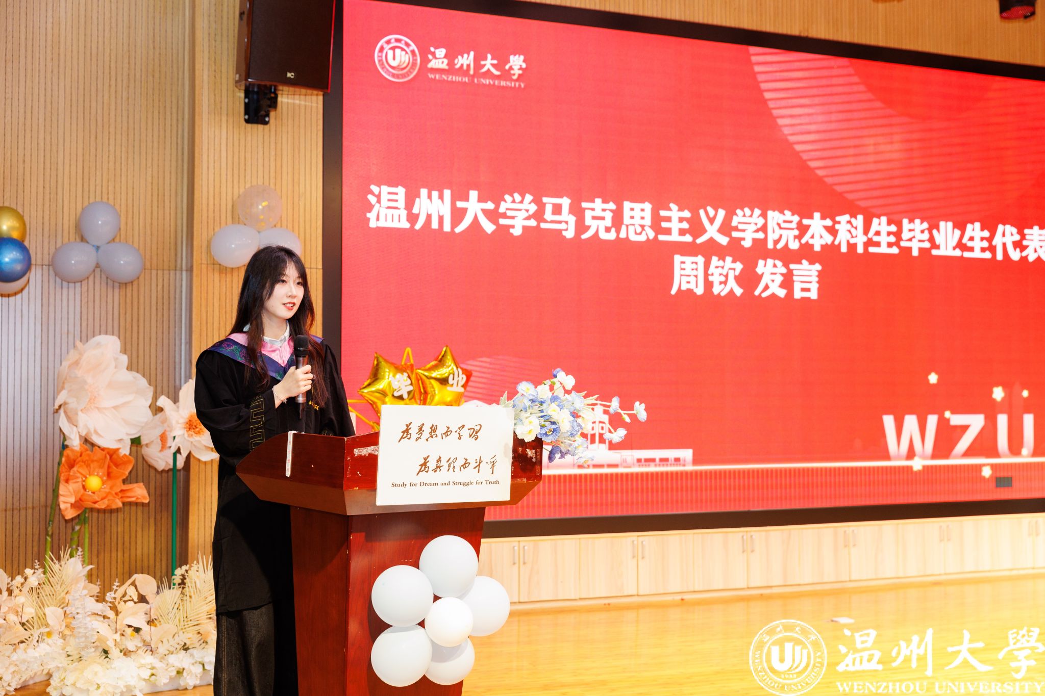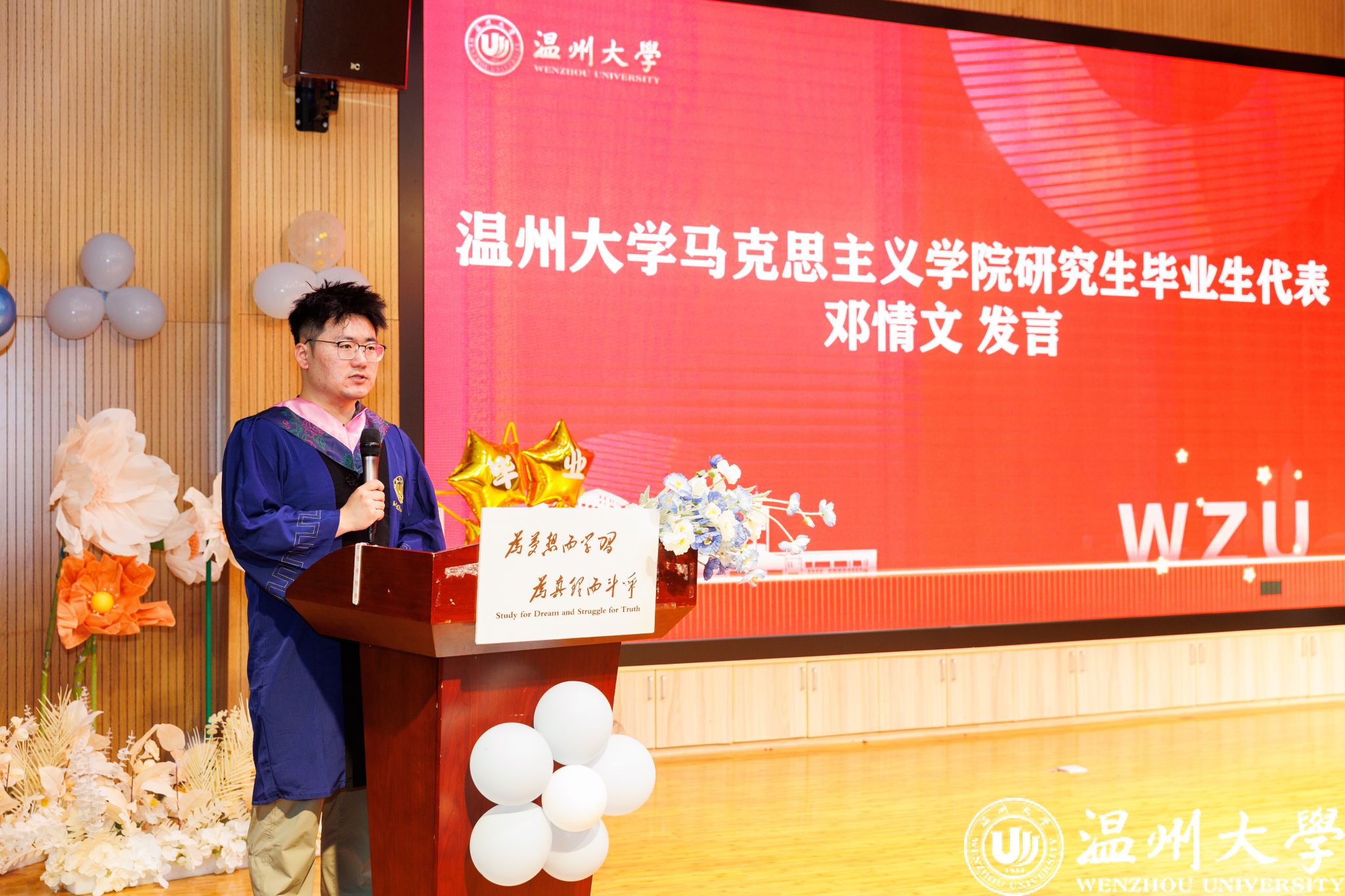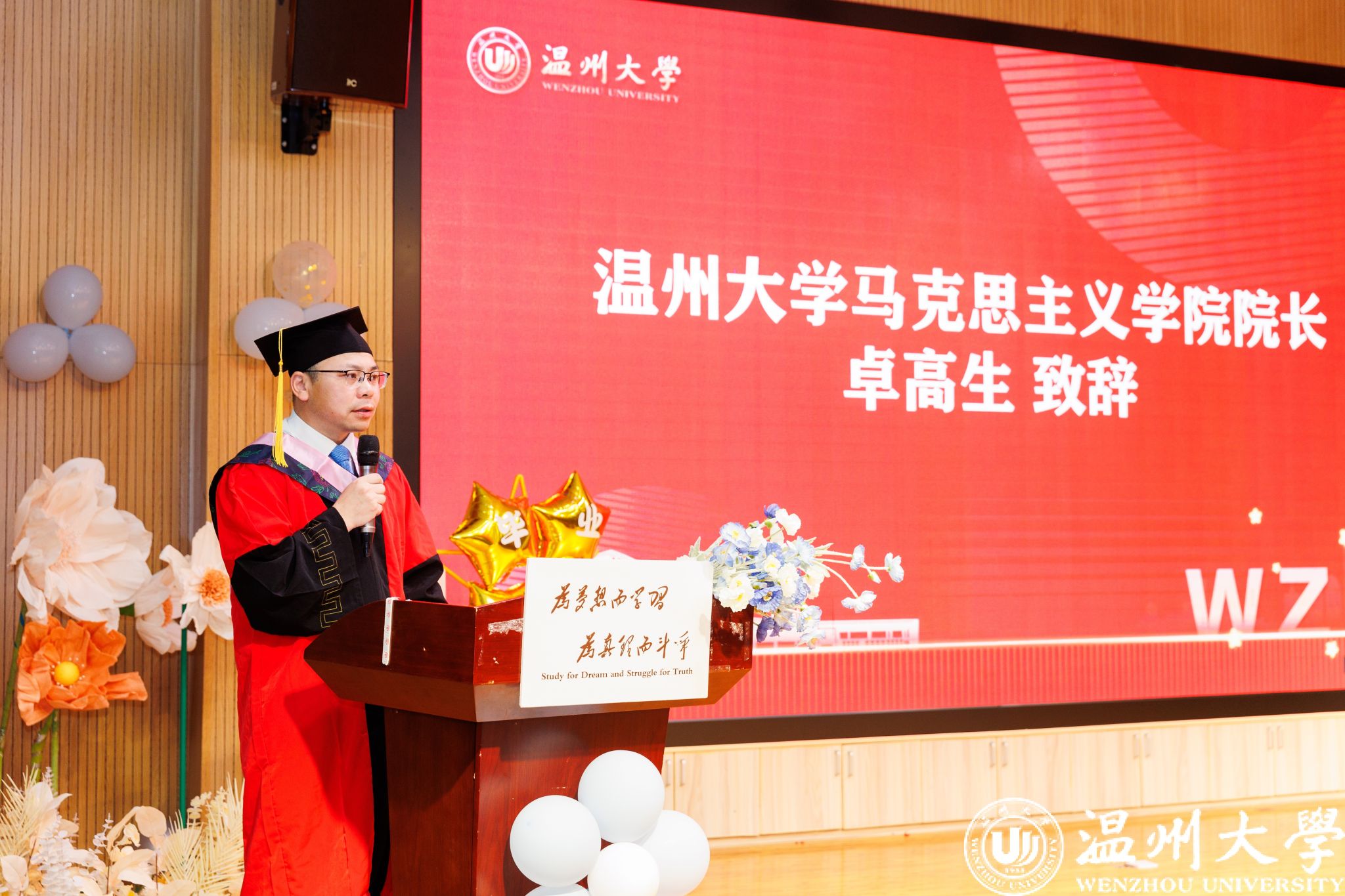典礼伊始,卓高生院长肯定了同学们全员奋进的励志故事,这些点点滴滴如同闪耀的星光,共同织就着同学们独一无二的马院征途。展望未来,卓院长对毕业生们提出了三点希望:一是希望同学们以理想为灯,照亮前路;二是希望同学们以实践为师,淬炼担当;三是希望同学们以奋斗为桨,永续前行。最后卓院长祝愿同学们如瓯江潮水般永不停歇,在“学无止境”中奏响奋进的壮歌!