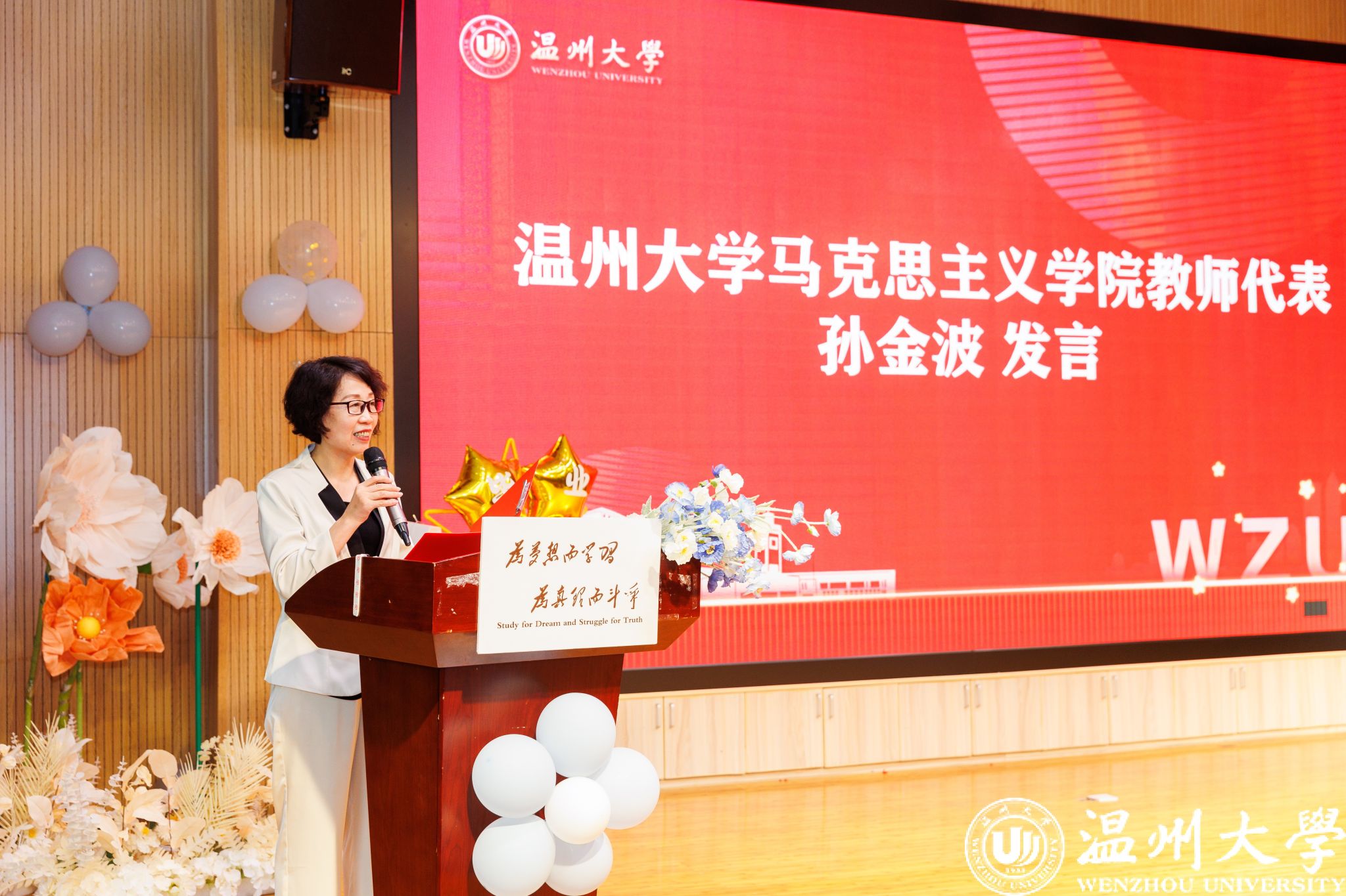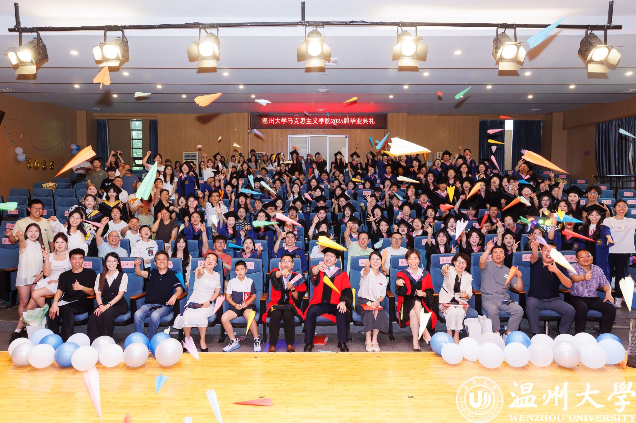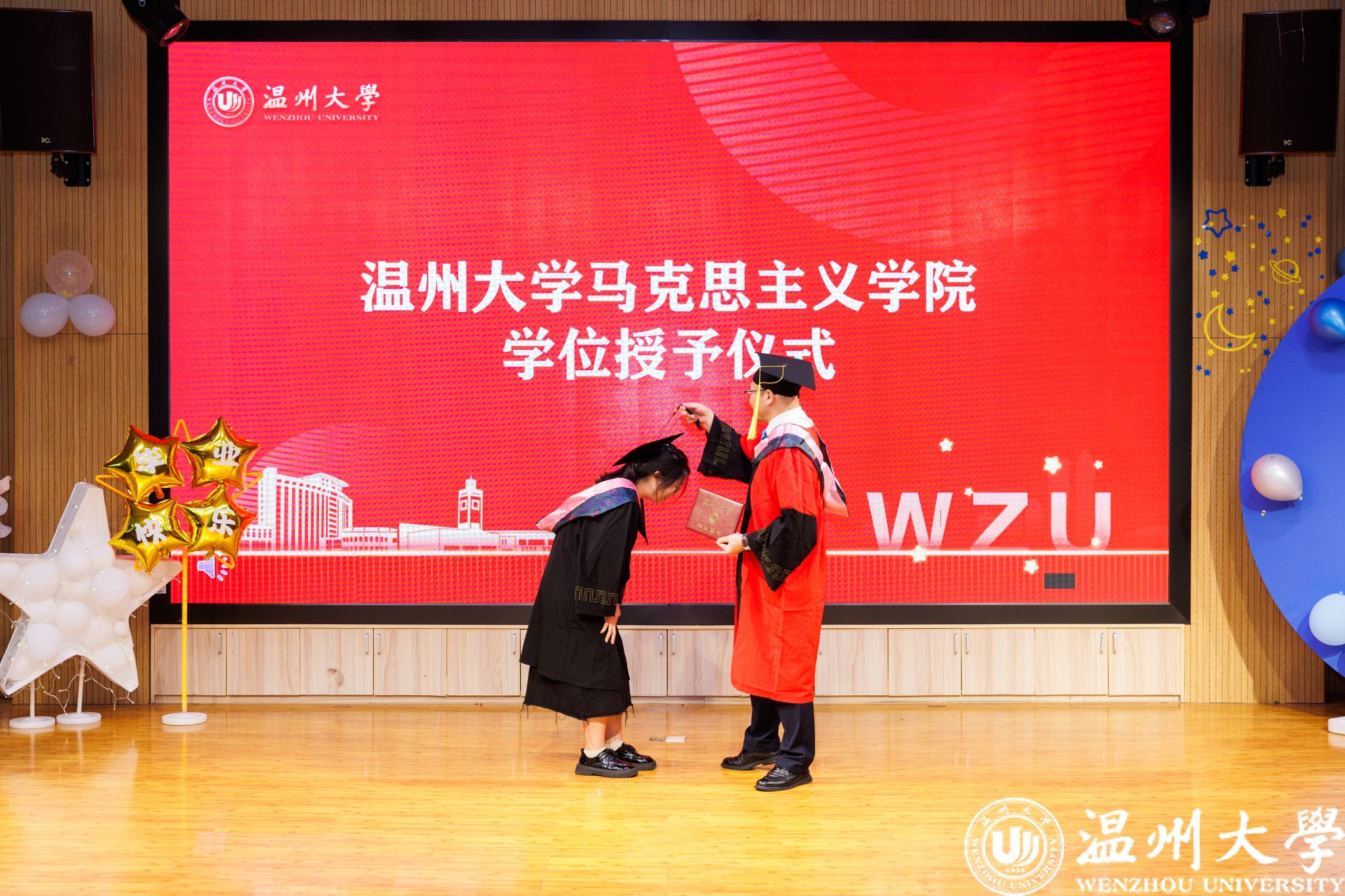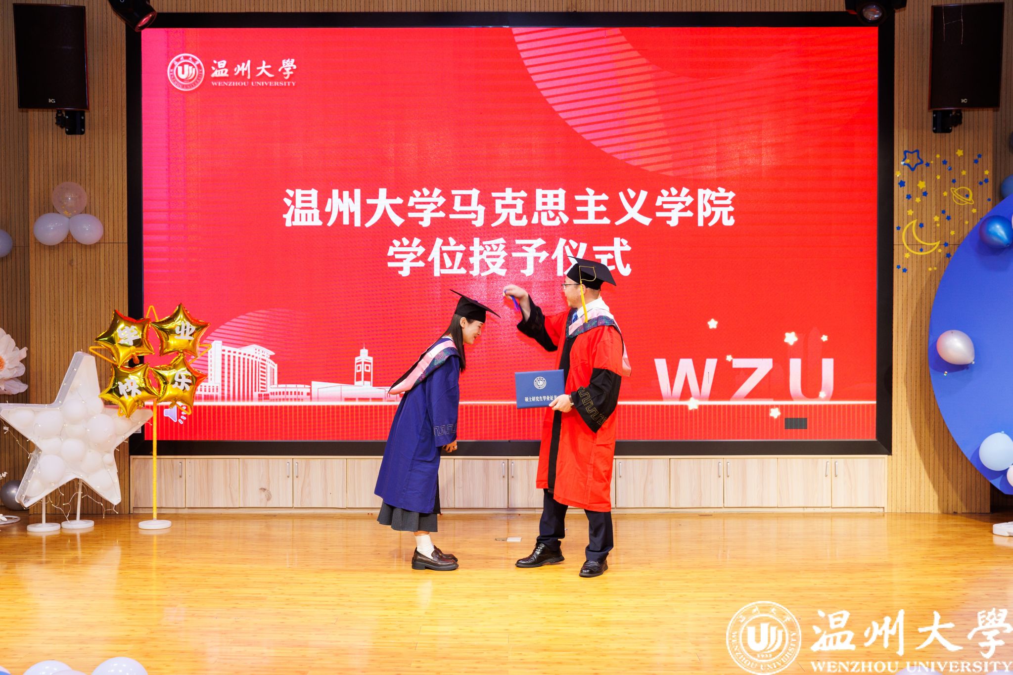 典礼伊始,卓高生院长肯定了同学们全员奋进的励志故事,这些点点滴滴如同闪耀的星光,共同织就着同学们独一无二的马院征途。展望未来,卓院长对毕业生们提出了三点希望:一是希望同学们以理想为灯,照亮前路;二是希望同学们以实践为师,淬炼担当;三是希望同学们以奋斗为桨,永续前行。最后卓院长祝愿同学们如瓯江潮水般永不停歇,在“学无止境”中奏响奋进的壮歌!