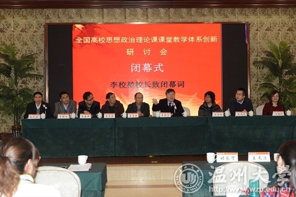 李校堃校长在闭幕式讲话中充分肯定了学校马克思主义理论学科建设和思想政治理论课教学改革所取得的丰硕成果。他结合自身经历向与会专家代表热情洋溢地介绍了来温州创新创业的优势条件,认为高校创新发展建设需要教学平台、科研平台和产业平台三个“轮子”一起转,温州地处“长三角”、“珠三角”和“海西”三个经济带的交汇处,充满活力,是创业的绿洲。温州人特别富有勇于改革、顽强拼搏、吃苦耐劳的精神。温州的企业老板特别重视党建工作,善于利用马克思主义中国化成果在企业管理发展中发挥特殊作用,也敢于在实践中创新探索适合中国实际的马克思主义新思想新观念。因此,在温州研究马克思主义,具有特殊的社会条件和优势。李校长还热切希望在未来“十三五”时期,国产传媒