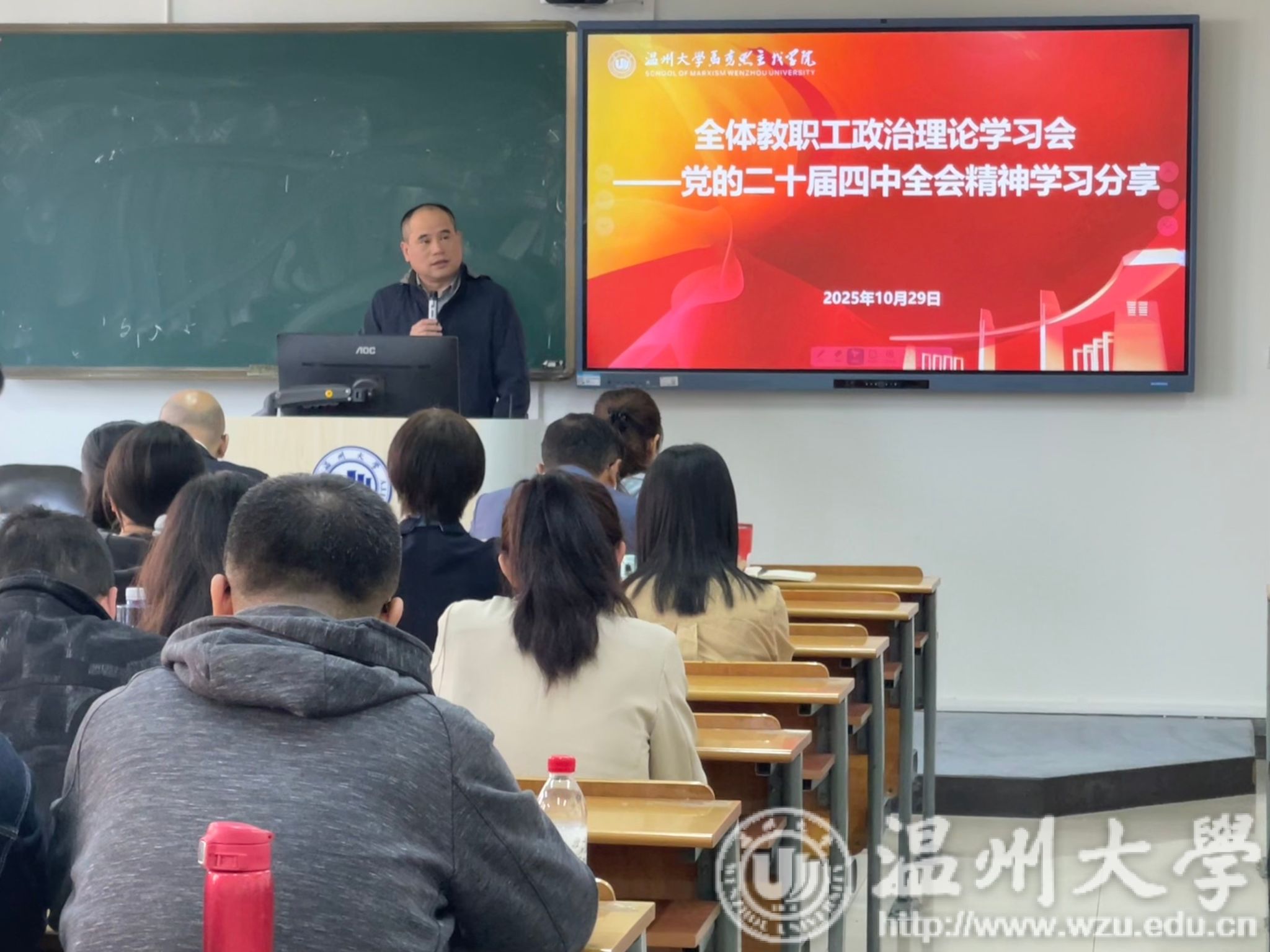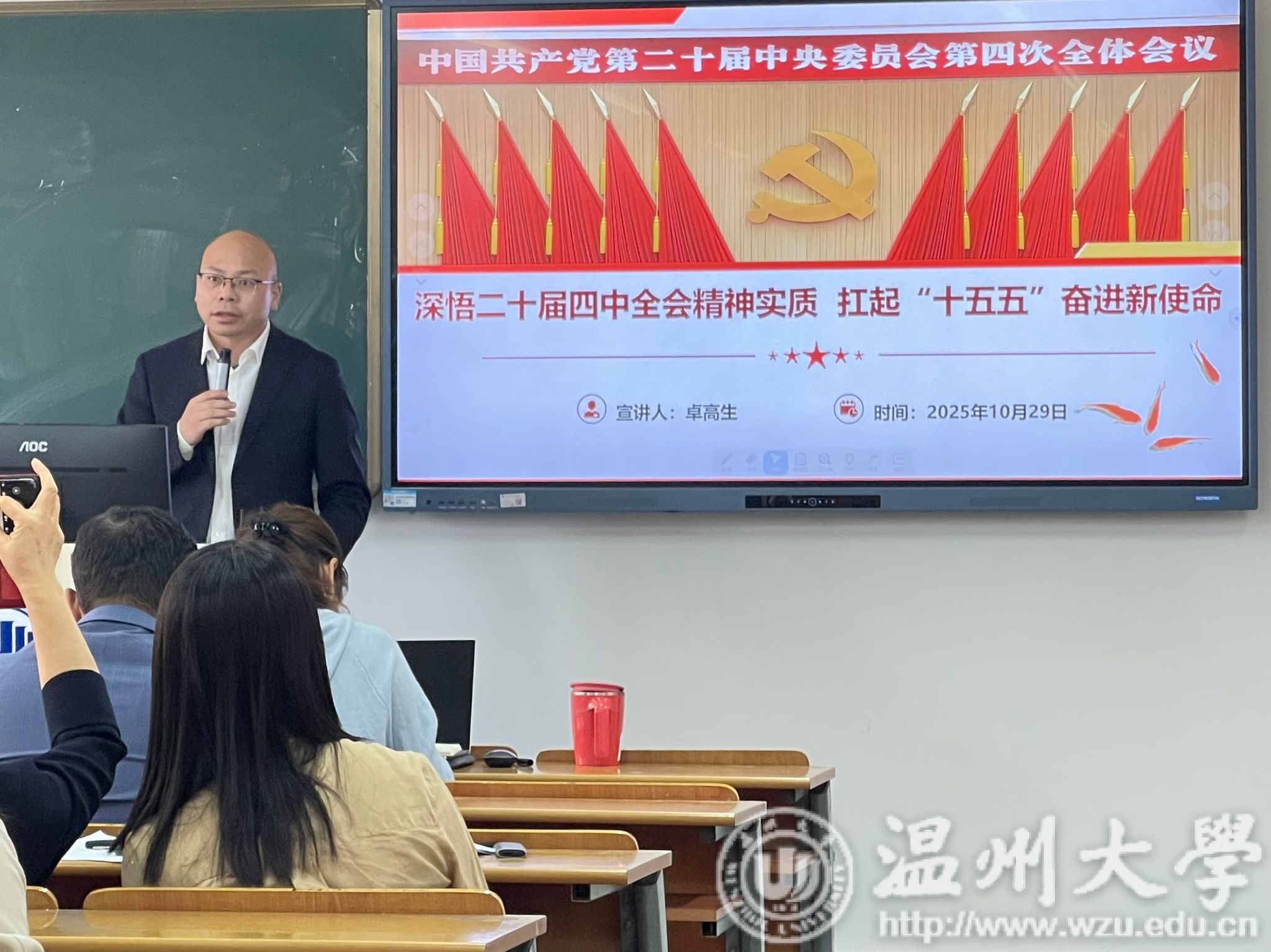 最后,卓高生院长作党的二十届四中全会精神专题学习分享。他强调学习党的二十届四中全会精神是当前首要政治任务,需深刻领悟精神实质,把握中国式现代化进程关键阶段,将其融入教学、学科建设与科研,并加强相关课题、论文等科研成果产出。编制和实施国民经济和社会发展五年规划,是我们党治国理政的重要方式,制定“五年规划”彰显制度优势,从实行第一个“五年计划”到2025年“十四五”规划即将收官,一个又一个五年,诠释了不同时期中国经济社会发展的历史标识,创造了世所罕见的经济快速发展和社会长期稳定两大奇迹。未来五年,各位老师要按照“十五五”经济社会发展规划,积极将教育科研、人才培养、社会服务等方面工作与经济社会发展需求紧密结合,为做好学院“十四五”收官、“十五五”开局夯实人才根基、积蓄发展动能,以思想引领凝聚奋进力量。要将党的二十届四中全会精神学习贯彻、研究阐释纳入学科任务,探索推进马克思主义理论、中共党史党建学学科建设。