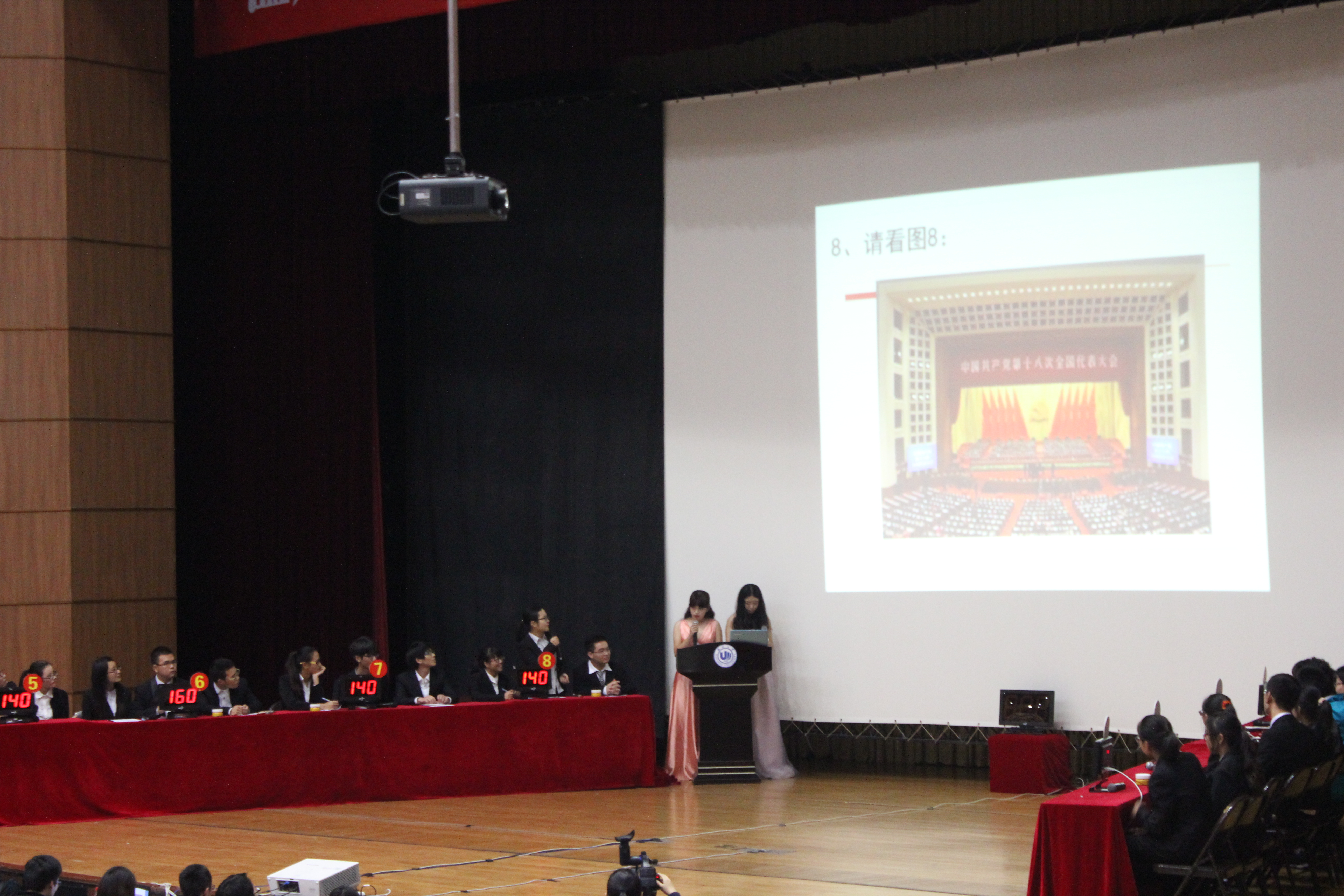 本次活动自本学期九月份启动以来,历时两个多月,主要在本学期开设思想政治理论课的全校2000多名大二学生中进行选拔,经历了初赛、复赛,最后全校15个学院各产生了一支代表队进入决赛(每支代表队4名队员,其中包括一名候补队员)。决赛分南校区(8支代表队)、北校区(7支代表队)共2场,分别于11月26日下午和晚上在大学生活动中心育英大礼堂进行。莅临本次大赛的领导有校党委副书记