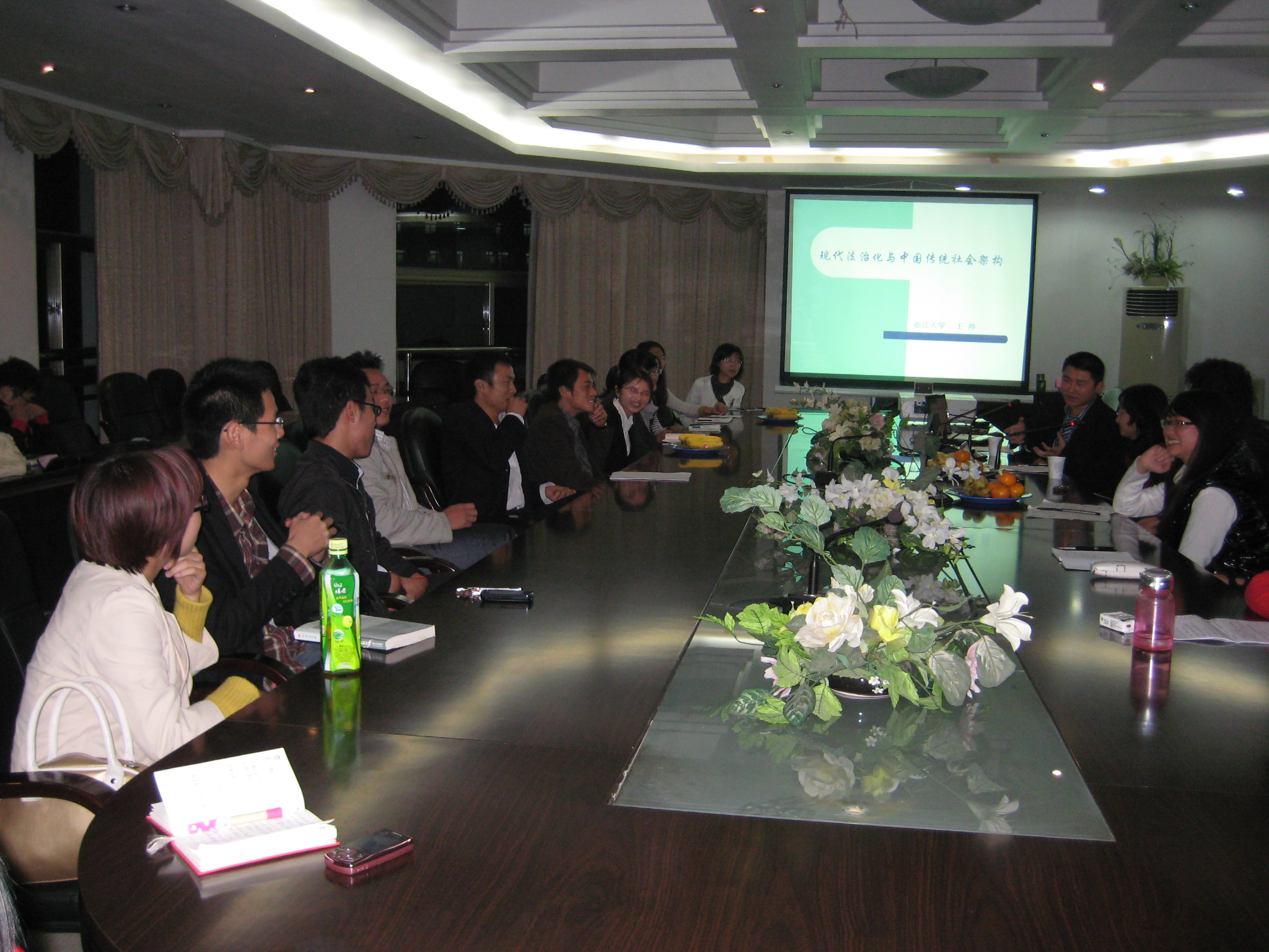为活跃思政部研究生学术研究气氛,引导研究生树立崇尚科学,推动锐意创新的精神,同时,为扩大研究生的学术研究视野,加强与兄弟院校的学术交流,10月26日晚,浙江大学研究生求是学社社长、法学院博士生会主席王帅博士应国产传媒