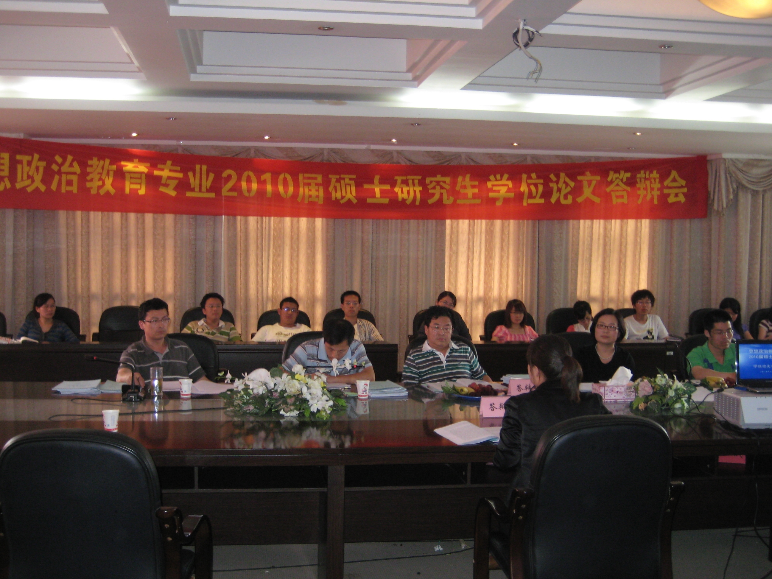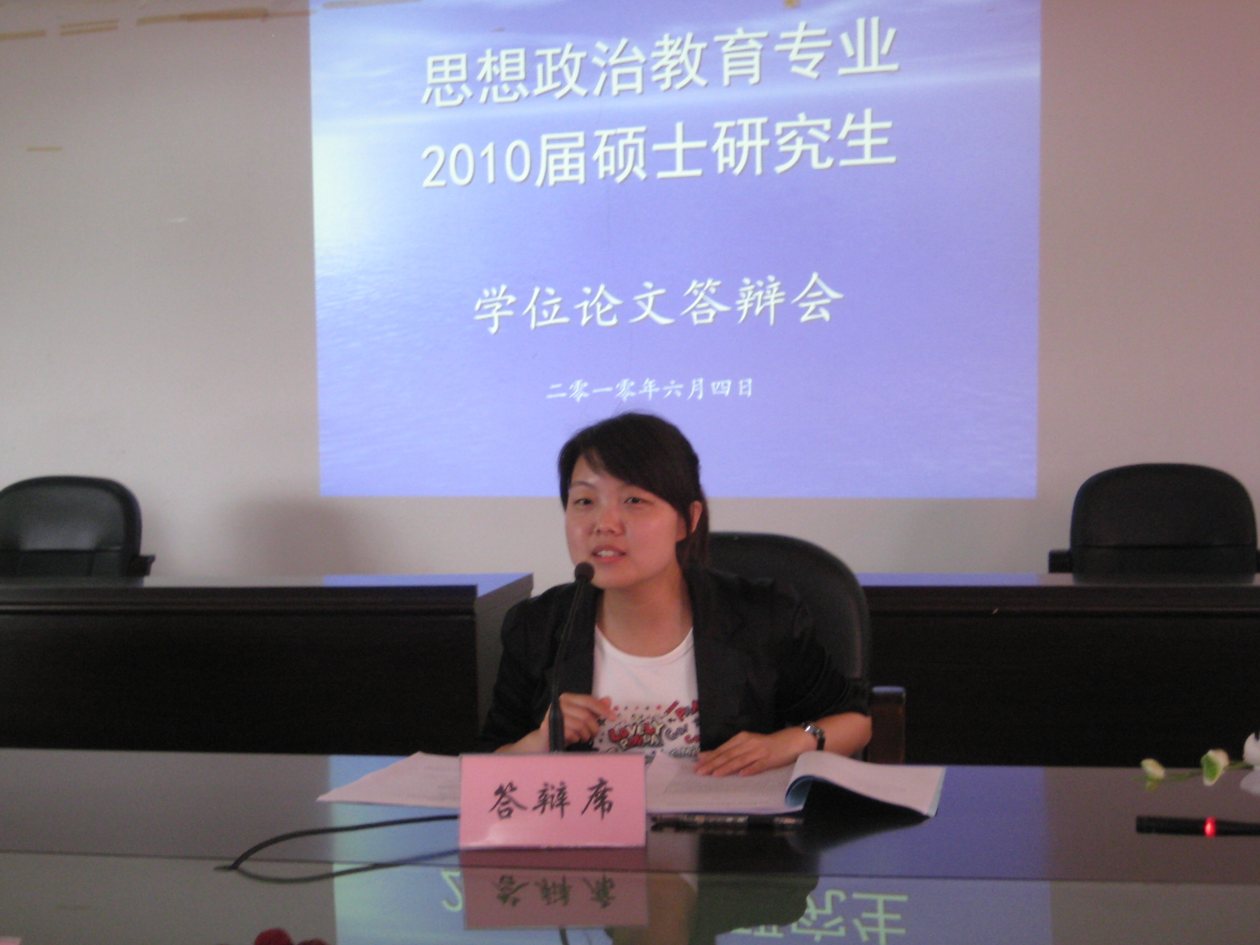 本次答辩由段治文教授主持。研究生按抽签顺序依次阐述自己的研究成果,整个答辩会现场气氛融洽,学生尽情的阐述自己的观点,专家们针对论文提出问题,毕业生经短时间准备回答了专家的提问。思想政治教育专业的七名毕业生顺利通过答辩。