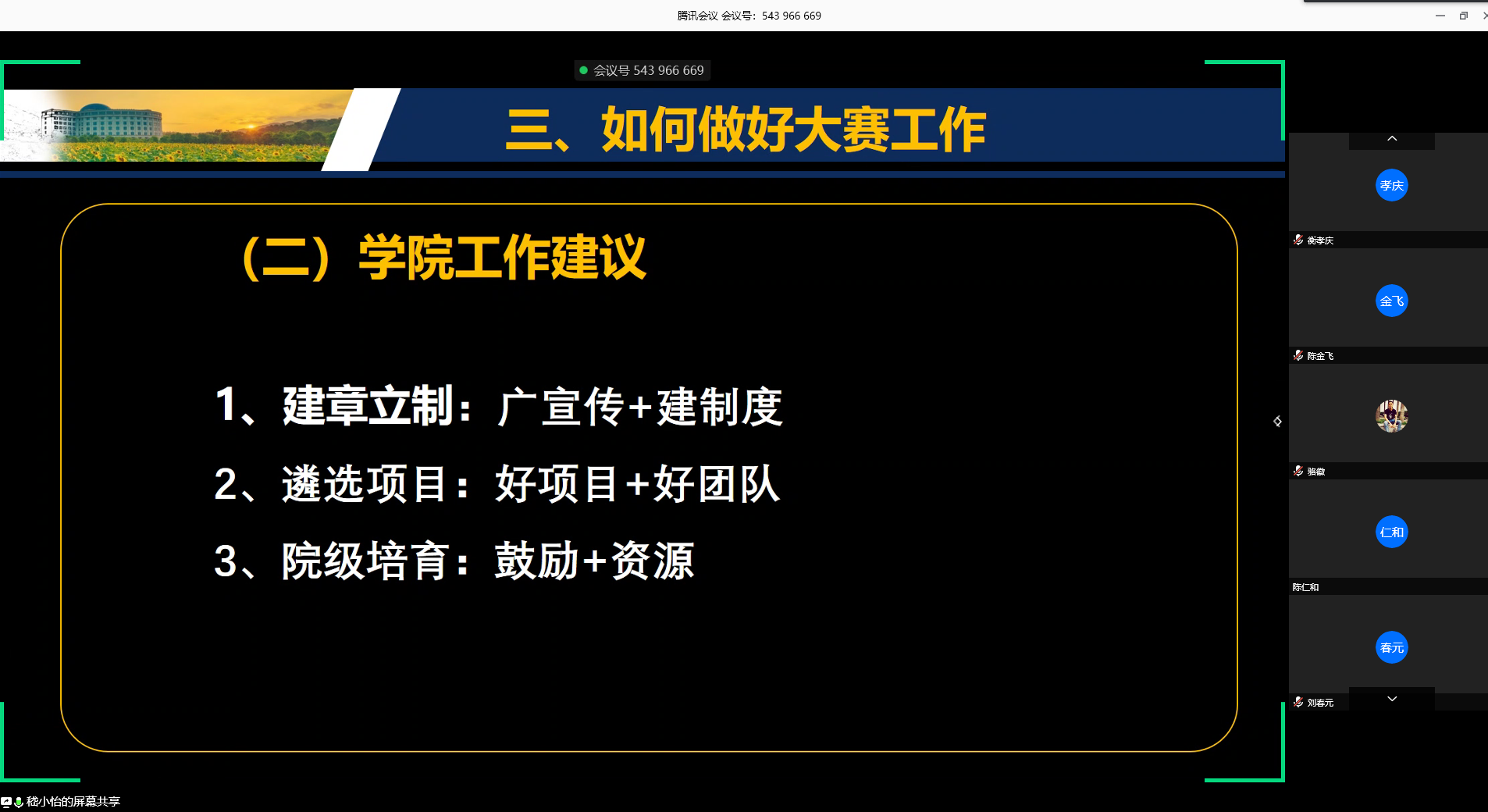 嵇小怡副院长向大家介绍了“互联网+大赛”基本情况。大赛自2015年举办以来,已经成功举办了五届,累计有947万名大学生、230万个团队参赛,涌现出一大批科技含量高、市场潜力大、社会效益好的高质量项目,展现了当代大学生奋发有为、昂扬向上的精神风貌,正日益成为培育创新人才的沃土,为建设创新型国家提供着源源不断的人才智力支撑。嵇小怡副院长详细解读了大赛的赛道、特质、各类赛道参赛基本要求。结合马院的专业特色和我校以往参赛案例,她认为马院师生可以积极备战“红旅赛道”,她还针对性地分析了“红旅赛道”历届获奖项目的类型和创新点。紧接着,她从评审规则、备赛工作、学校相关激励政策进行了详细讲解,为国产传媒 下一步开展工作开拓了思路。