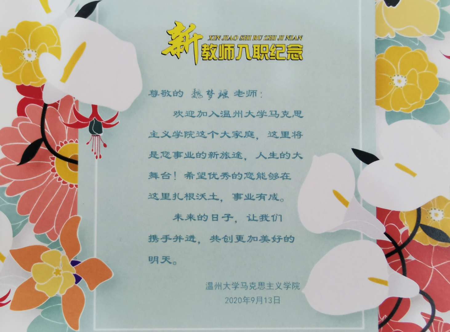 会议首先对2020年入职教师进行了简单而热烈的欢迎仪式,学院领导向新入职的王习明教授、石磊教授、刘海霞教授、梁家荣博士、左雪松博士、詹良水博士、魏梦瑶老师等八位教师送上了特别准备的鲜花和入职纪念卡。一束鲜花、一份情谊,希望新教师能够在马院大家庭开启事业的新旅途和人生的大舞台。