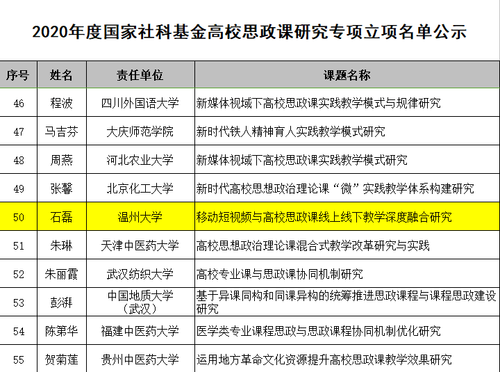 10月9日,2020年国家社科基金年度高校思政课研究专项立项名单公示,国产传媒 石磊教授的《移动短视频与高校思政课线上线下教学深度融合研究》获得立项,为国产传媒 学科建设再添新绩。