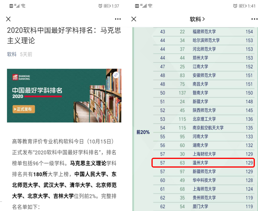 10月15日,高等教育评价专业机构软科正式发布“2020中国最好学科排名”。我校马克思主义理论学科今年在排行榜表现优秀,排名第57位,位居全国前16%,名列省内高校第一(除浙大外)。