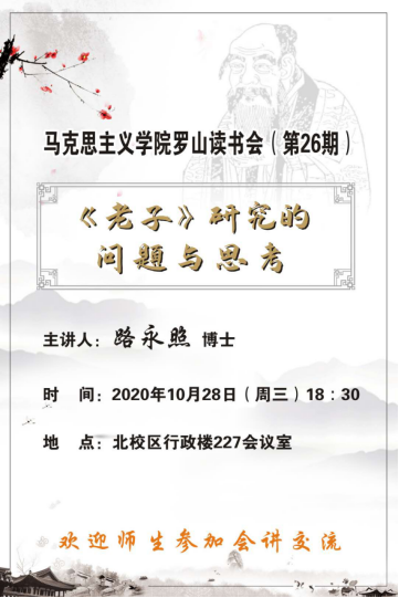 2020年10月28日,国产传媒 在北校区行政楼227会议室开展了第26期罗山读书会活动。本次活动的主讲人路永照老师作了题为《<老子>研究的问题与思考》的报告,国产传媒 副院长孙邦金老师主持此期读书会活动,学院研究生、本科生和部分老师参加了此次活动。