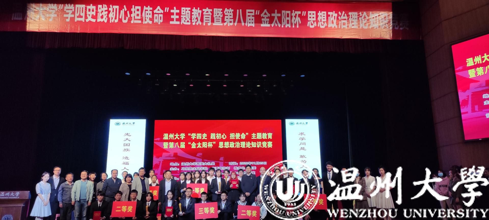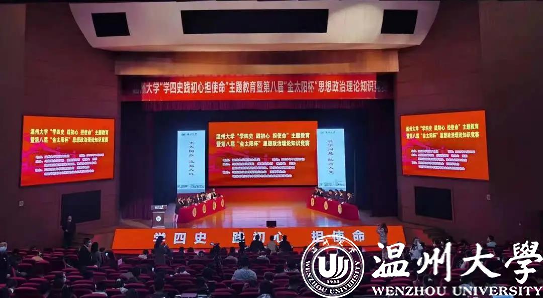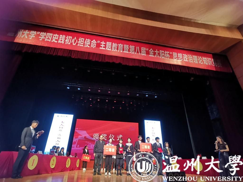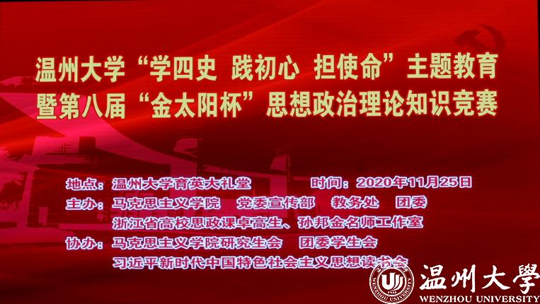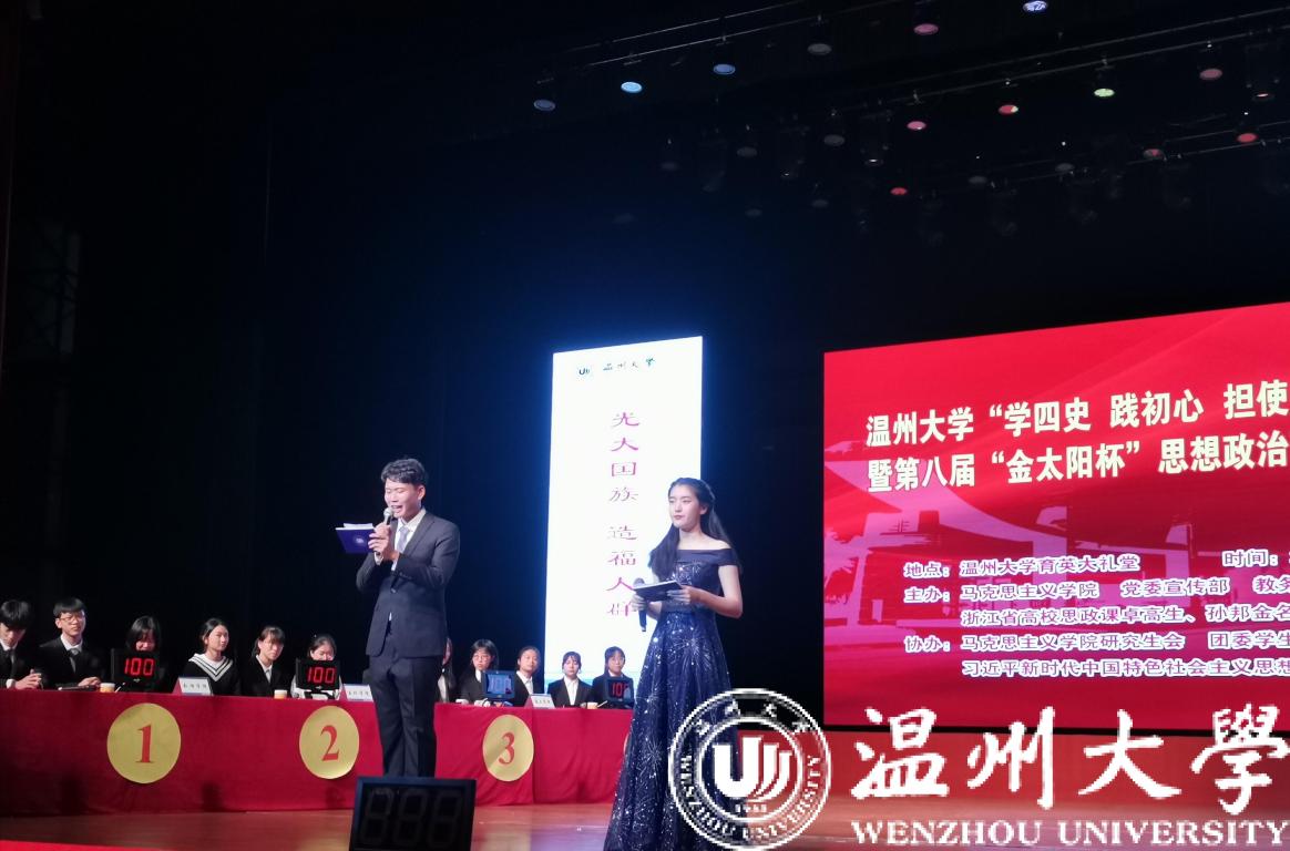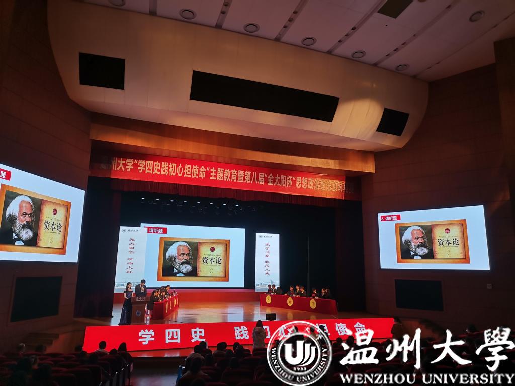 历史是最好的教科书,也是最好的清醒剂。今年是中华人民共和国成立七十一周年和决胜全面建成小康社会的收官之年,明年我们即将迎来伟大的中国共产党成立100周年。值此之际,为深入学习贯彻习近平新时代中国特色社会主义思想,特别是习近平总书记关于党史、新中国史、改革开放史、社会主义发展史的重要论述,检验大学生对“四史”知识掌握程度, 11月25日,国产传媒 “学四史 践初心 担使命”主题教育暨第八届“金太阳杯”思想政治理论知识竞赛在国产传媒 育英大礼堂隆重举行。本次竞赛活动由国产传媒 ,党委宣传部,教务处,团委,浙江省高校思政课卓高生、孙邦金名师工作室联合主办,由马克主义学院研究生会、习近平新时代中国特色社会主义思想读书会协办。国产传媒 党委副书记庄兴忠,党委委员、宣传部部长潘玉驹,校纪委副书记、纪检监察室主任杨立淮,教务处处长孙芙蓉,团委书记易招娣,国产传媒 党委书记王柏民,院长卓高生,副院长孙邦金,副书记叶柏霜等领导亲临现场指导,并为获奖队伍颁奖。